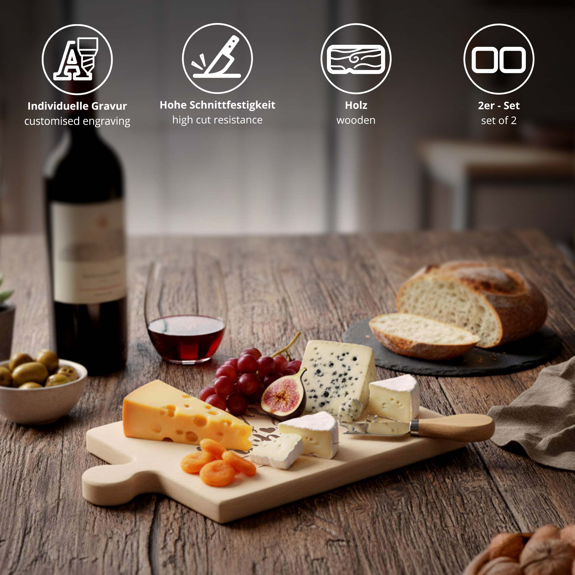 Die beiden Brettchen lassen sich ineinanderfügen und ergeben ein harmonisches Ganzes. Mit der persönlichen Gravur der Namen wird jedes Set zu einem einzigartigen Erinnerungsstück – ideal zur Hochzeit, zum Jahrestag oder als romantische Überraschung. Ob beim gemeinsamen Frühstück oder als dekoratives Element – dieses Set bringt Persönlichkeit und Gefühl in jeden Alltag.