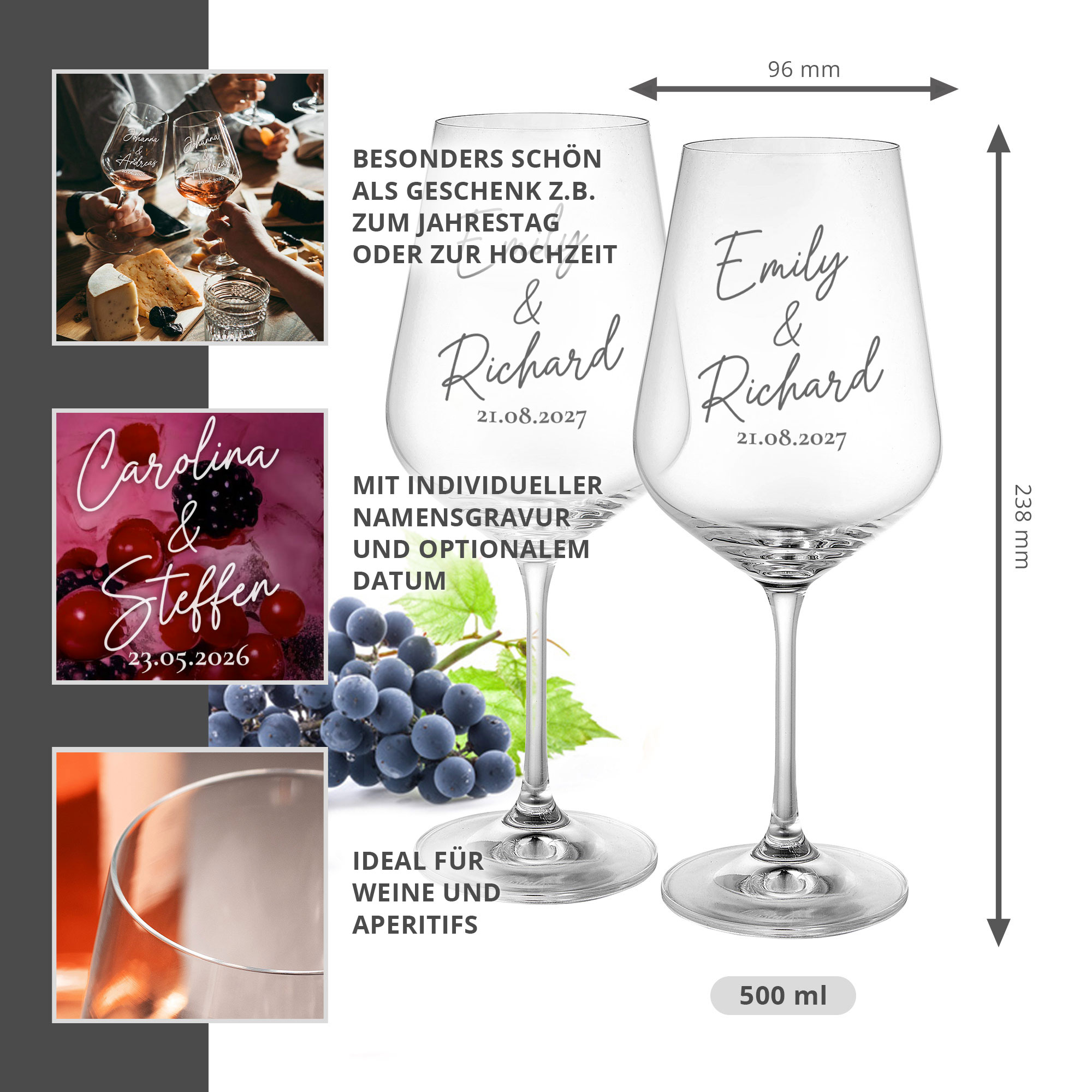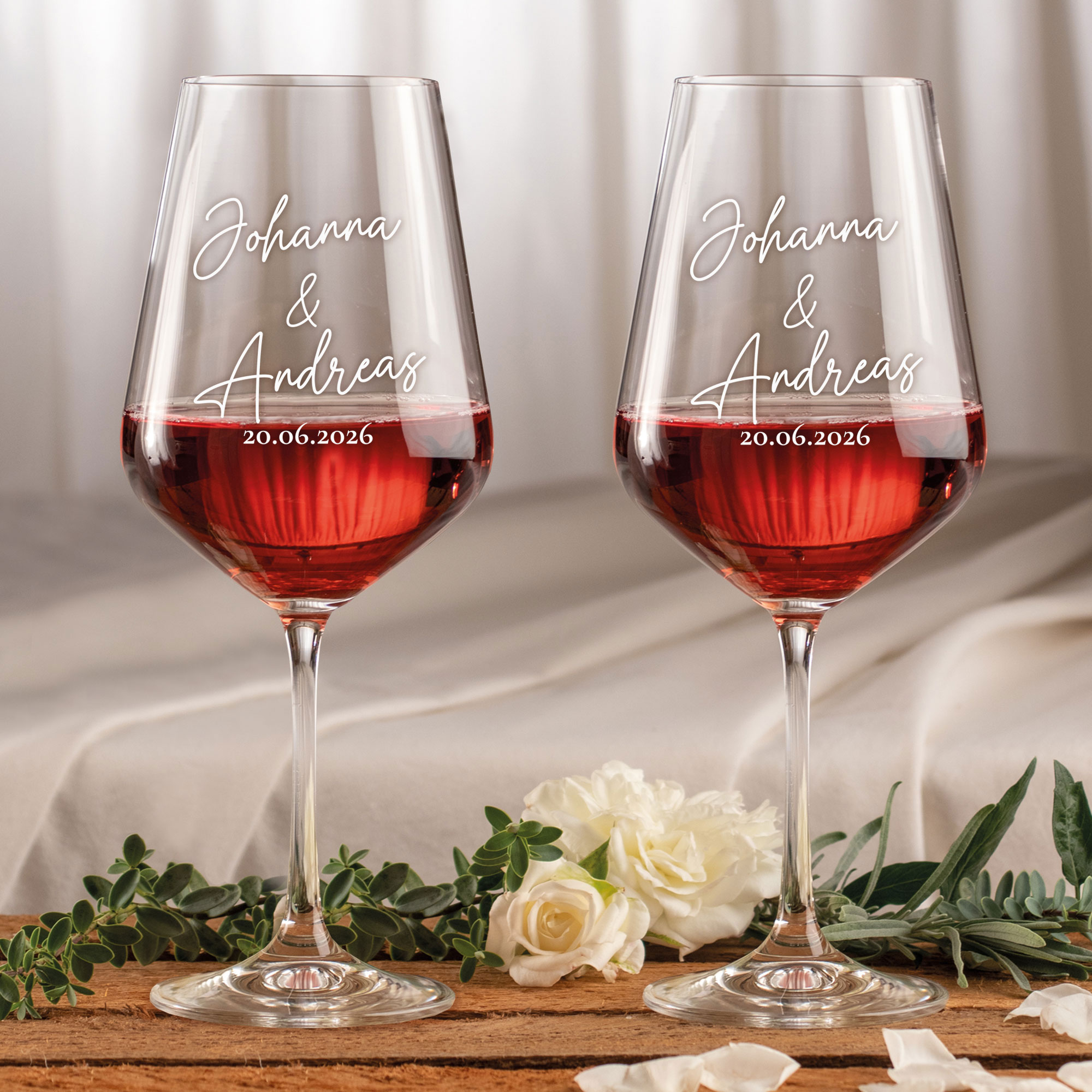 Gefertigt aus hochwertigem Klarglas und mit stilvoller Gravur versehen, vereinen die Gläser Design, Qualität und Emotion in einem. Ob für den gemeinsamen Abend zu zweit, ein Weintasting mit Freunden oder als stilvolles Accessoire auf dem Hochzeitstisch – diese Weingläser sind mehr als nur Trinkgefäße: Sie sind ein persönliches Symbol der Zweisamkeit.