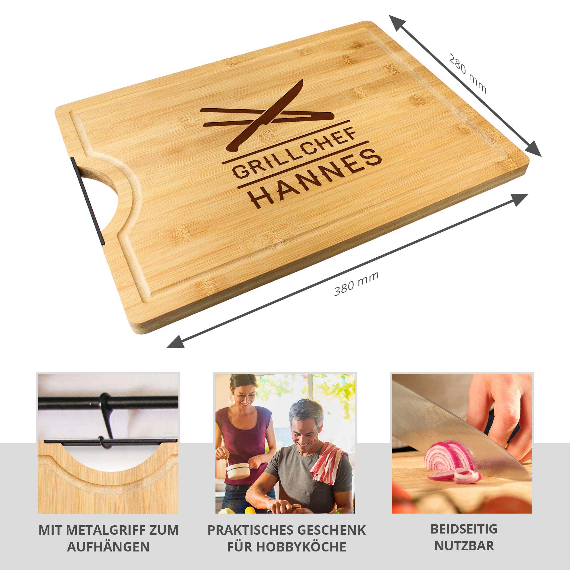 - Personalisiertes Schneidebrett mit Grillchef-Gravur und Wunschnamen