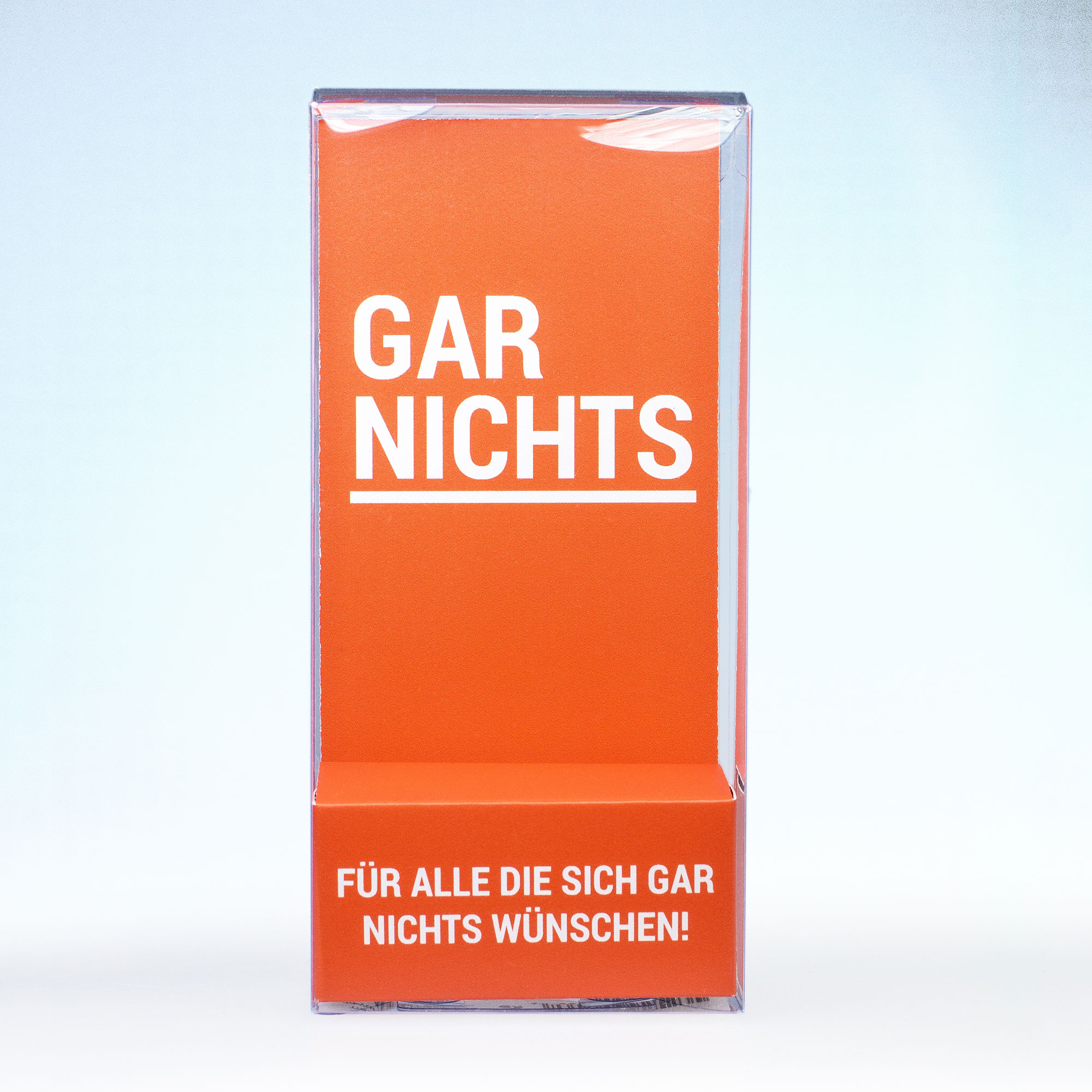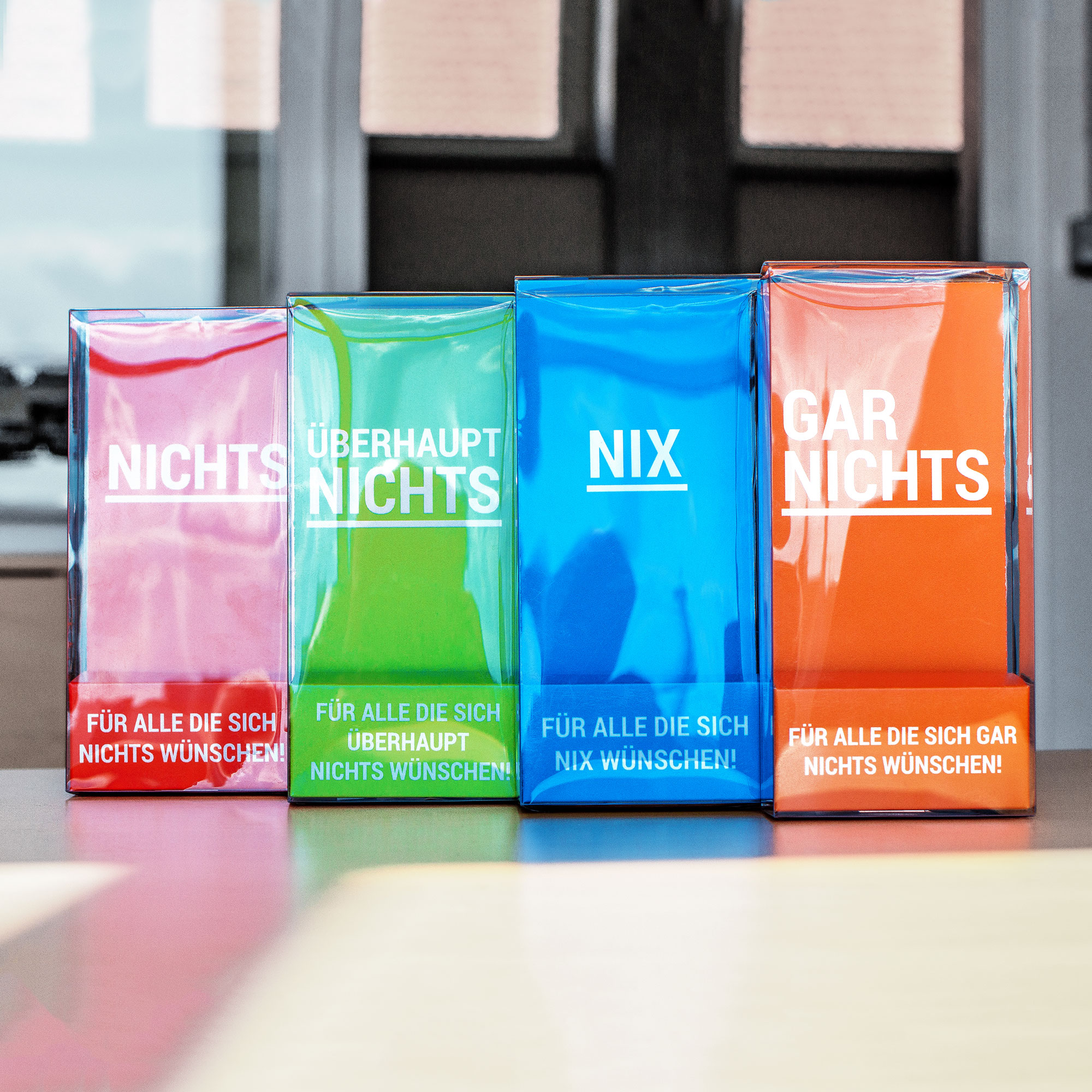 - Der Tipp am Rande: Wenn Du jemanden wirklich zum Nachdenken bringen willst, schenk ihm Nichts – aber in vierfacher Ausführung. Ideal auch als Notfall-Geschenk für spontane Anlässe oder als Running Gag bei Familienfeiern!