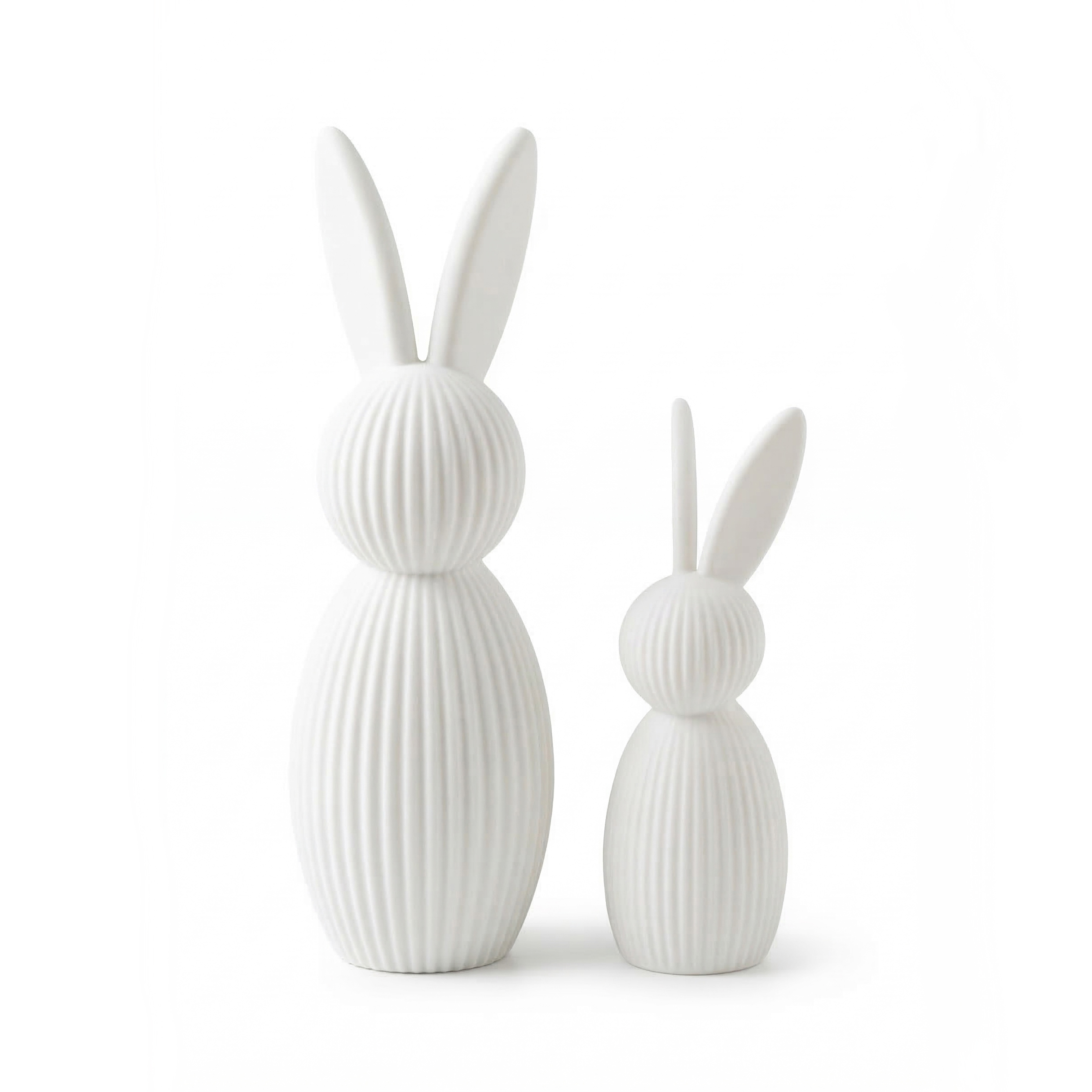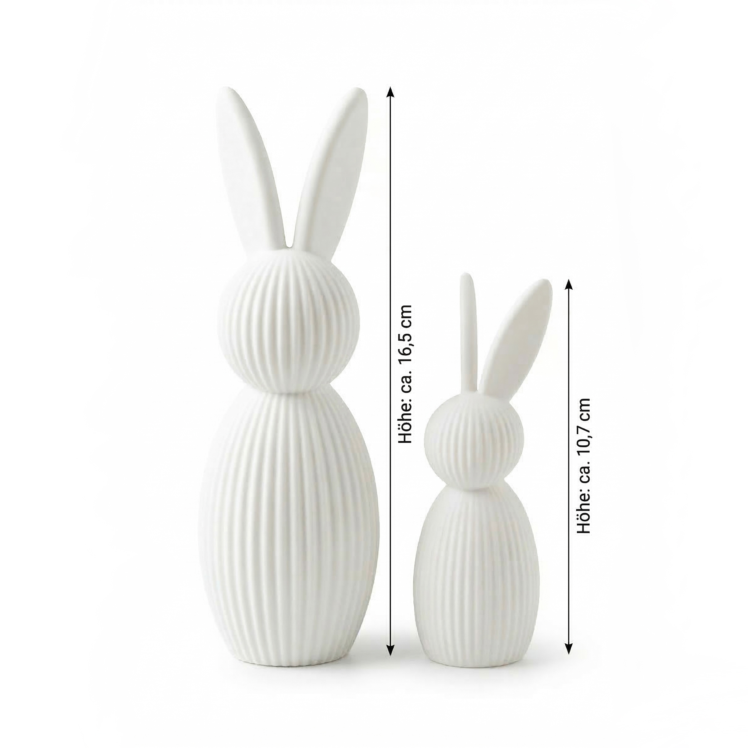 Die beiden unterschiedlich großen Hasen harmonieren perfekt miteinander und wirken besonders schön auf Sideboards, Regalen, Fensterbänken oder im Eingangsbereich. Durch die feine, strukturierte Oberfläche entsteht ein moderner Look, der sich wunderbar in skandinavische, minimalistische oder natürliche Wohnstile einfügt.