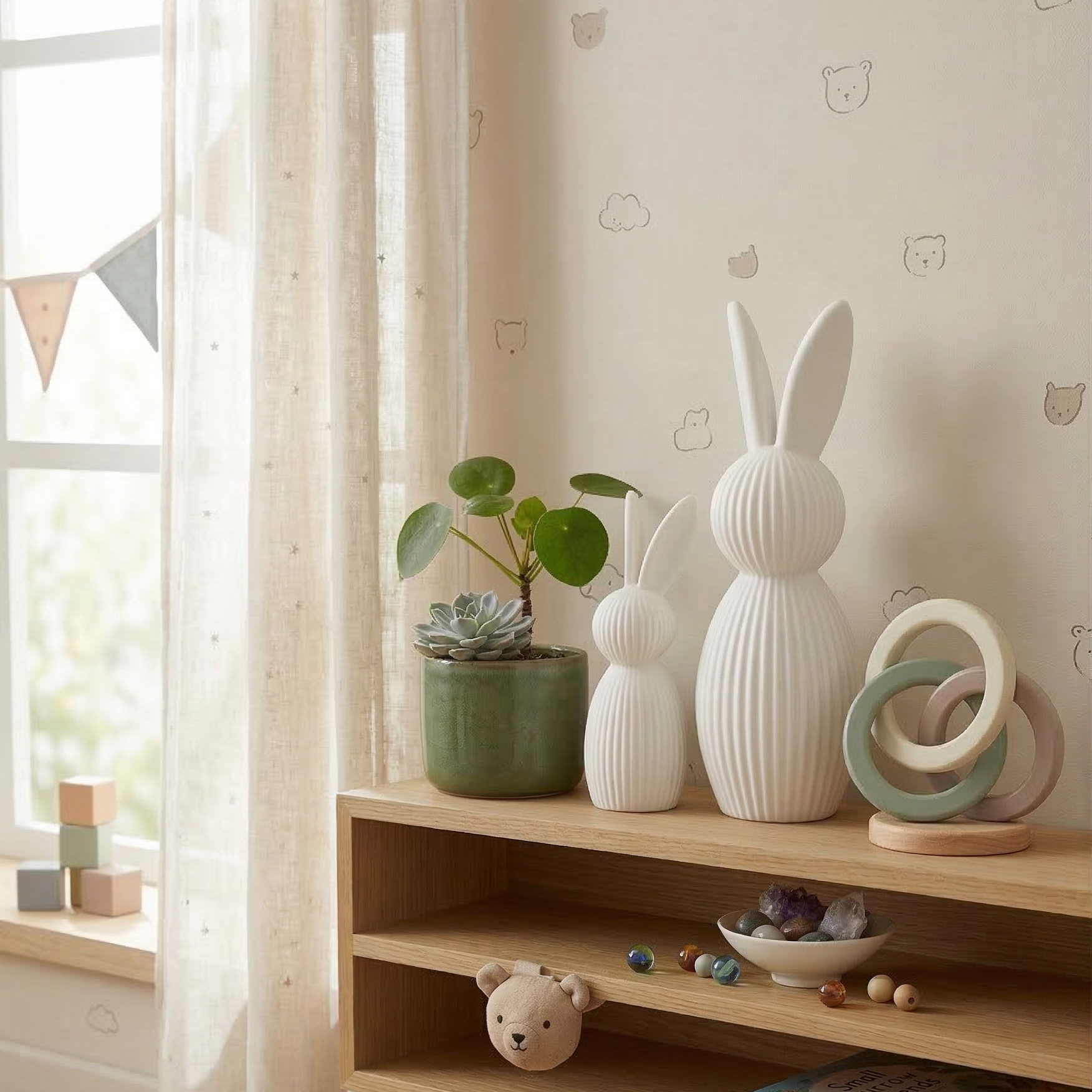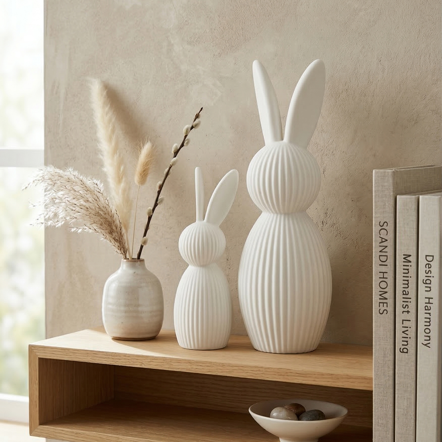 Tipp: Besonders schön wirken die Hasen zusammen mit Trockenblumen, Kerzen oder Naturmaterialien im Regal oder auf einem Tablett arrangiert.
