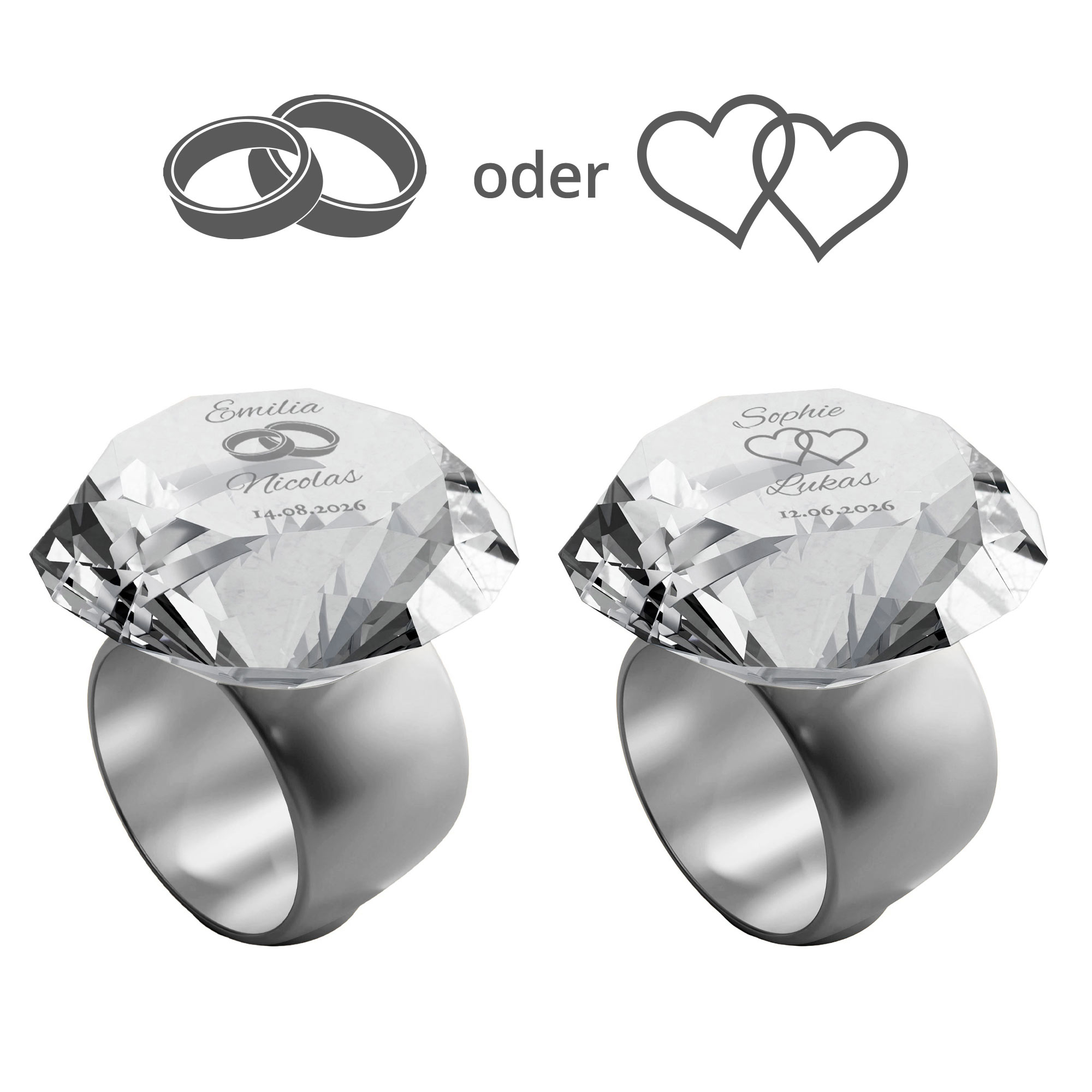Diamant Kristall mit Gravur zur Hochzeit und Ring Displayständer Silber