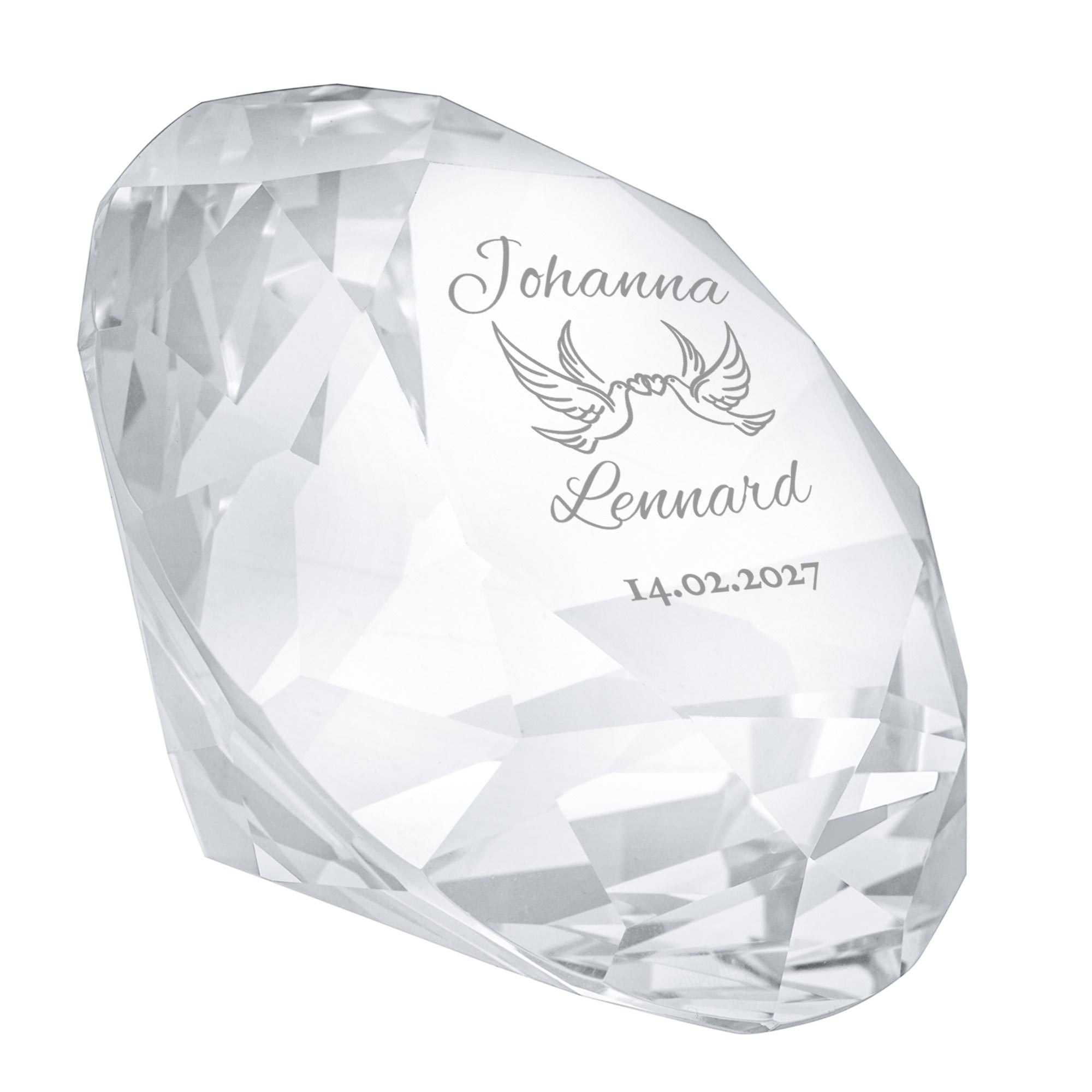 Tauben stehen seit jeher als Symbol für Liebe, Frieden und Treue – genau das, was eine Ehe ausmacht. Der personalisierte Diamantkristall mit Taubenmotiv ist deshalb ein besonders romantisches Geschenk zur Hochzeit. Mit der individuellen Gravur wird der funkelnde Kristall zu einer persönlichen Erinnerung an den schönsten Tag im Leben eines Paares. Der elegante Ringhalter sorgt dafür, dass der Diamant stilvoll präsentiert werden kann.
