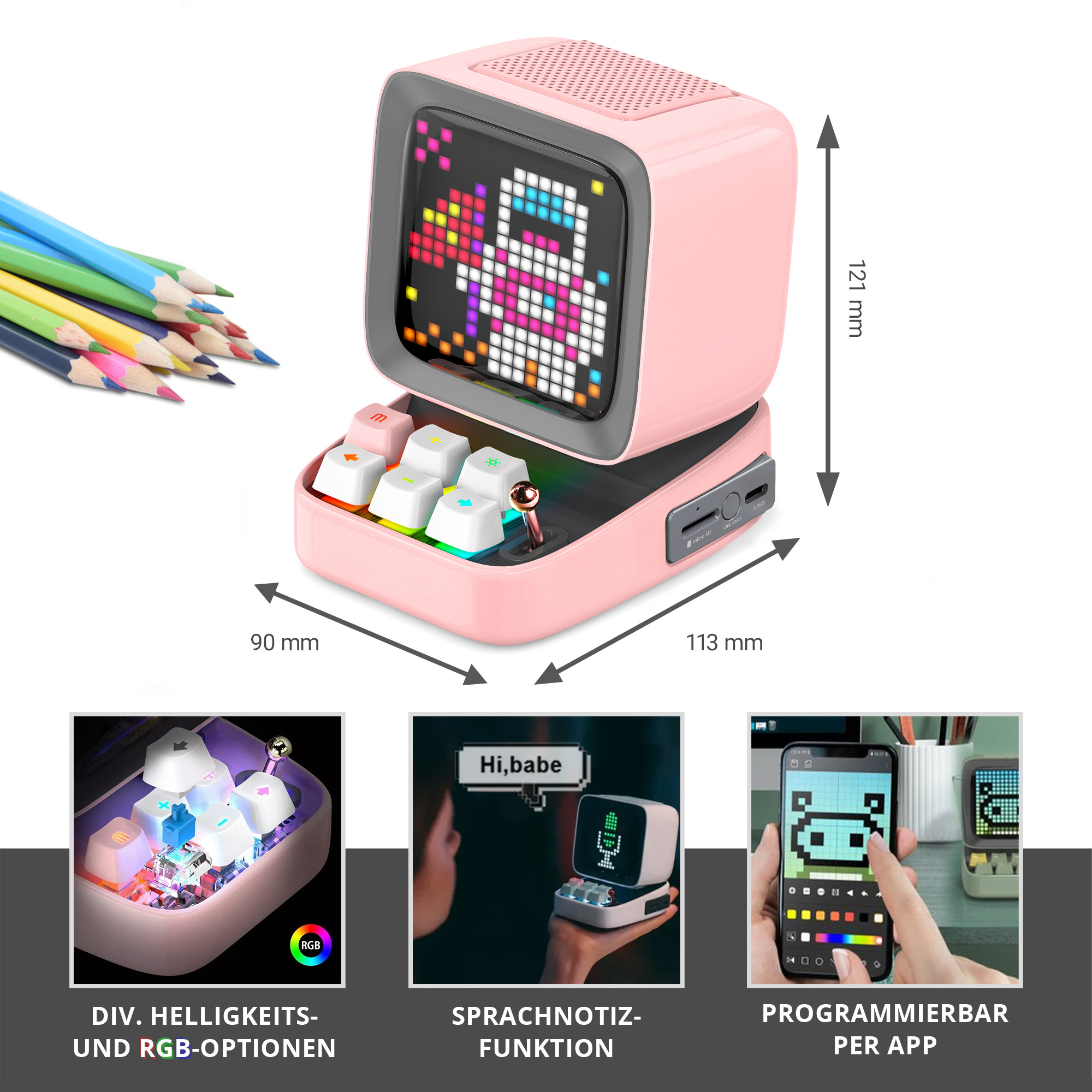 Verbinde Dein Mobilgerät via Bluetooth und starte mit dem Ditoo Plus Deine eigene Pixel-Party! Die Musikbox im Retro Look überzeugt mit hoher Soundqualität und einer ganzen Menge an überraschenden Tools. Die vielseitige 360 Grad Box wird über die Tasten am Gerät sowie die passende "Divoom" App gesteuert und kombiniert Features wie Uhrzeit, Wetterbericht, Stoppuhr oder Musikmixer in nur einem Gerät. Zudem kannst Du Deine eigene Pixel-Art kreieren und über das 16 x 16 Pixel Display präsentieren. Hier ist Spaß garantiert!