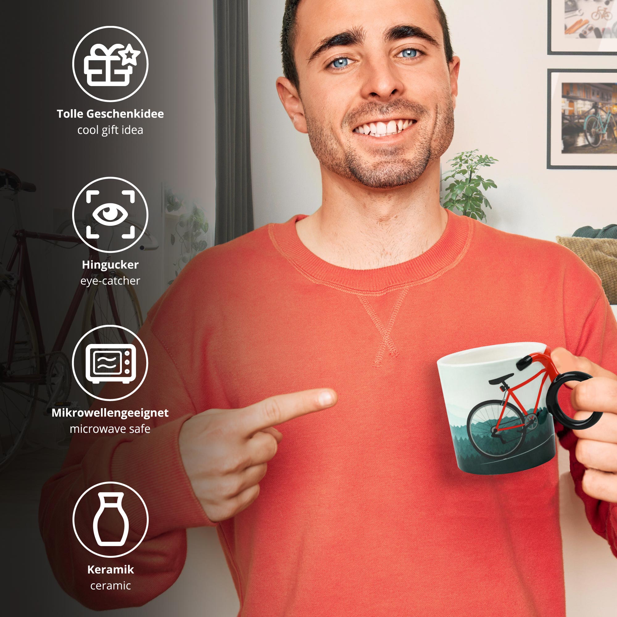 Ob Du die erste Radtour planst oder einfach gemütlich in den Tag starten willst – dieser Kaffeebecher bringt Schwung in Deine Morgenroutine. Das hochwertige Keramikdesign zeigt ein stilisiertes Fahrrad vor einer idyllischen Landschaft und begeistert mit einem ganz besonderen Detail: Der Henkel ist ein echtes Highlight und erinnert an ein Fahrradlenkrad – inklusive rotem Rahmen.