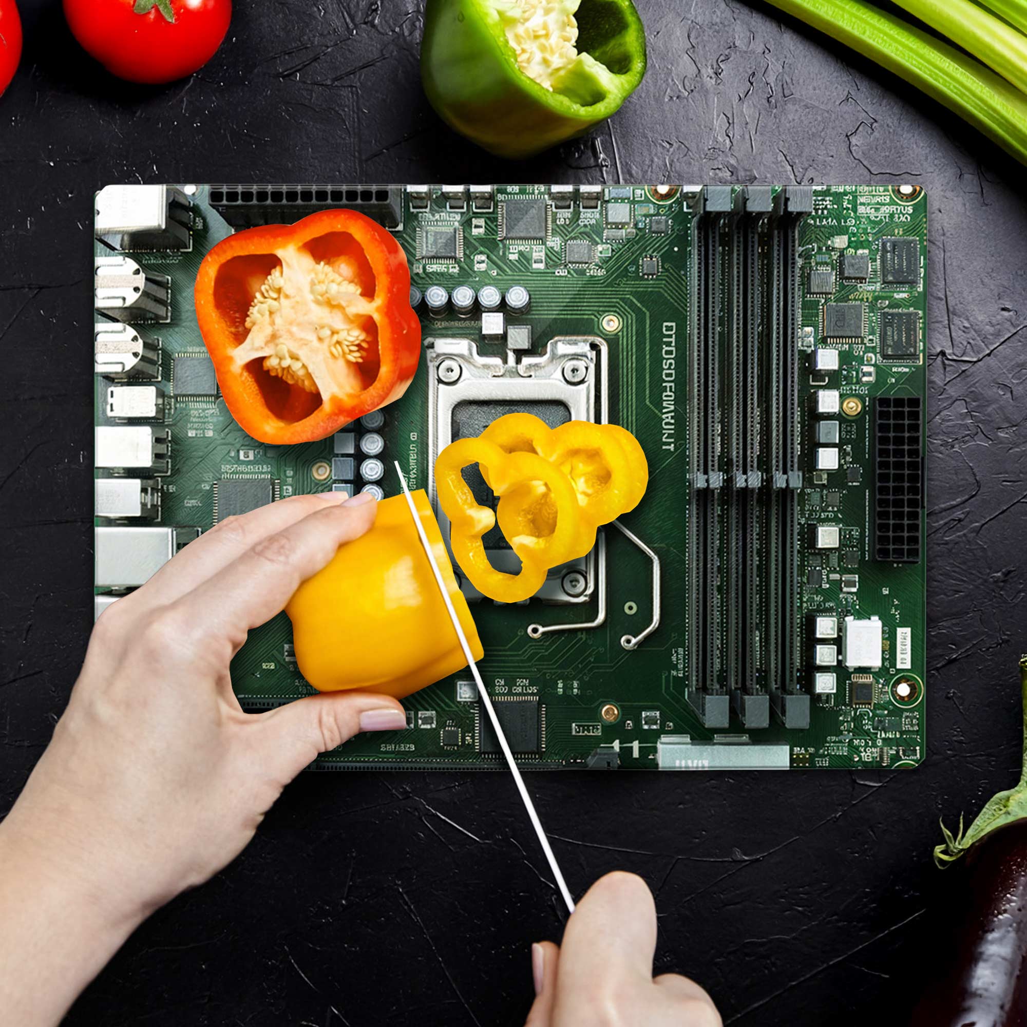 Du bist Technikliebhaber, Nerd oder einfach Fan von außergewöhnlichem Küchendesign? Dann ist dieses Schneidebrett Dein perfektes Upgrade! Das hochwertige Glasbrett zeigt die detaillierte Draufsicht eines Motherboards – mit Prozessor-Sockel, RAM-Bänken und Co. Ein echter Eyecatcher, der Funktionalität mit kreativem Stil verbindet.