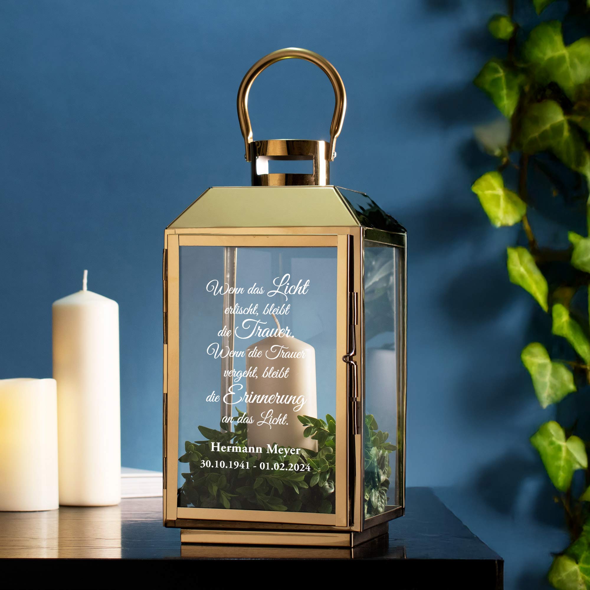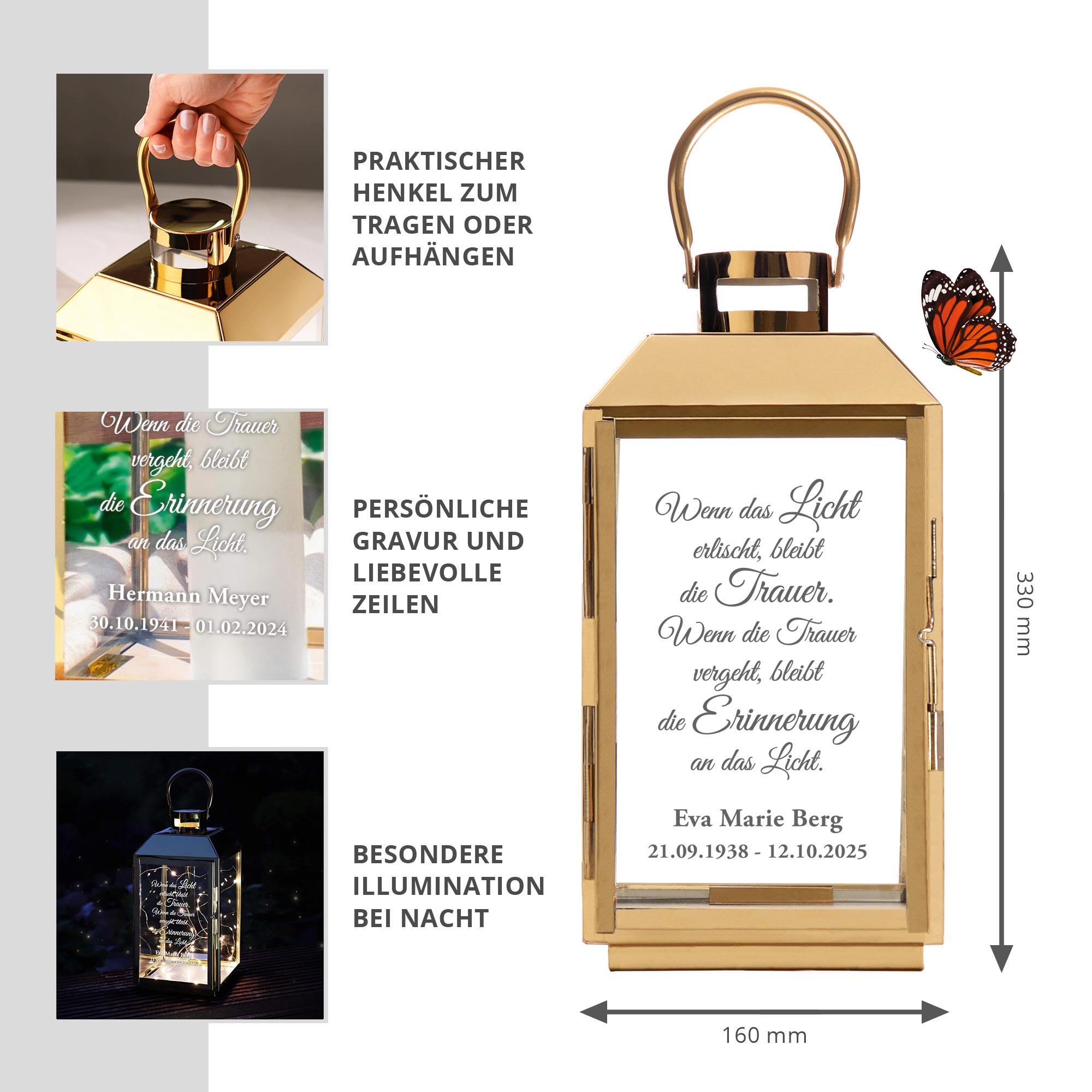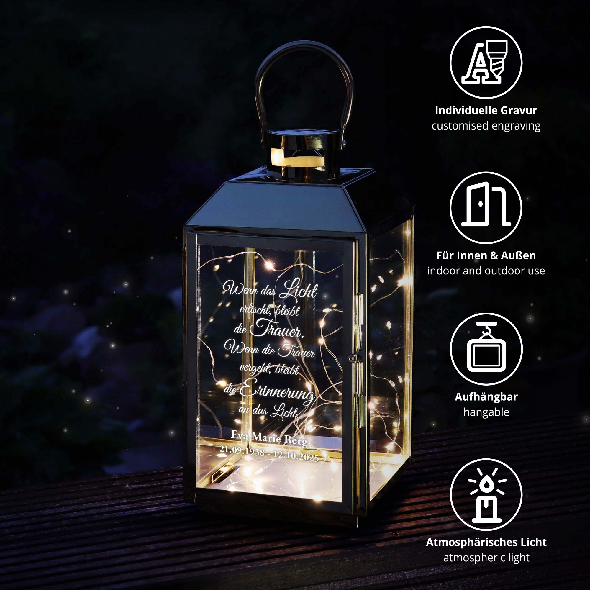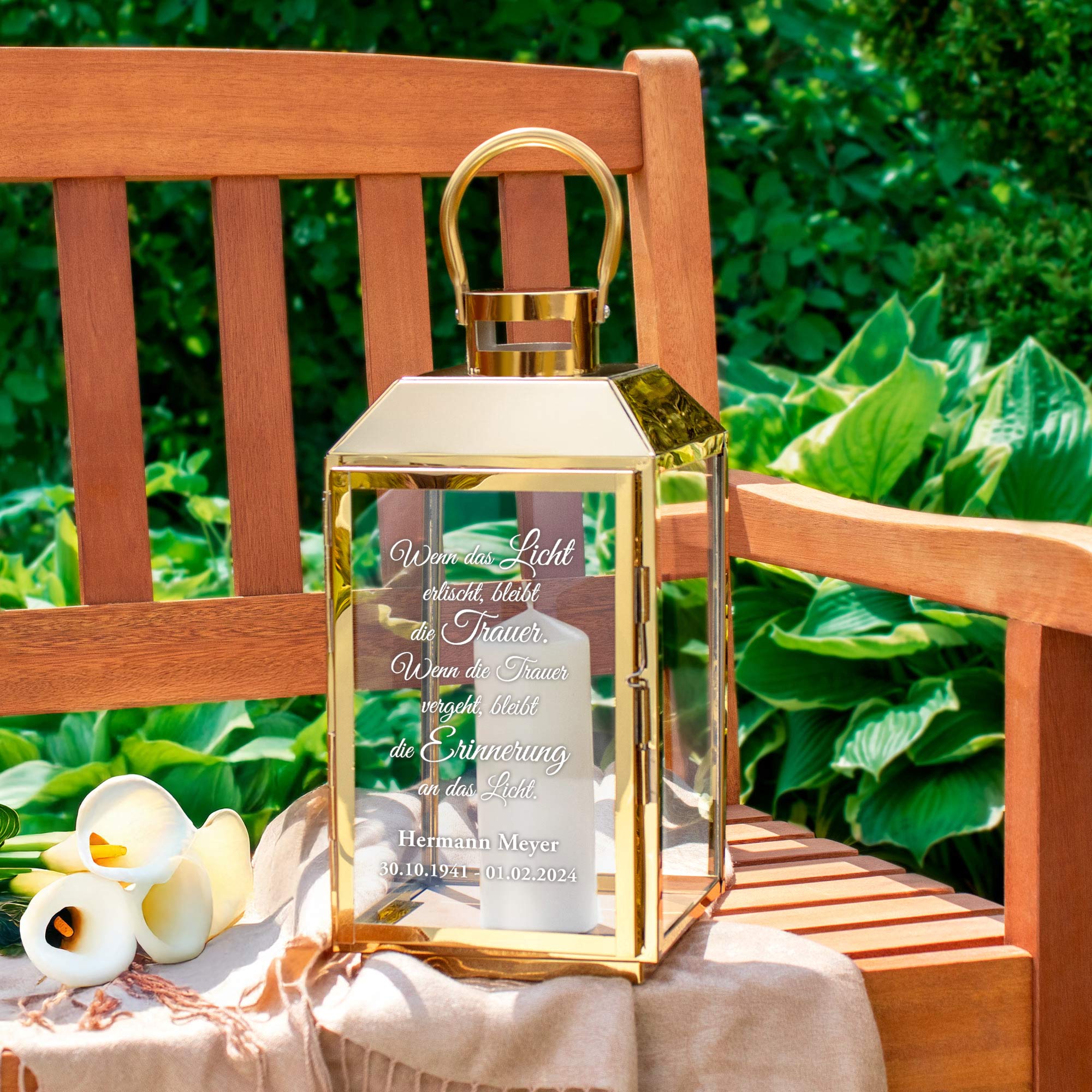 Diese goldene Grablaterne vereint elegantes Design mit einem bewegenden Abschiedsspruch – und spendet Licht in dunklen Momenten. Die Gravur trägt den Vers "Wenn das Licht erlischt, bleibt die Trauer. Wenn die Trauer vergeht, bleibt die Erinnerung an das Licht" in filigraner Schrift, ergänzt durch den Namen und das Geburts- und Sterbedatum des geliebten Menschen. Das warme Gold verleiht der Erinnerungslaterne eine edle Note, während das sanfte Licht Trost spendet.