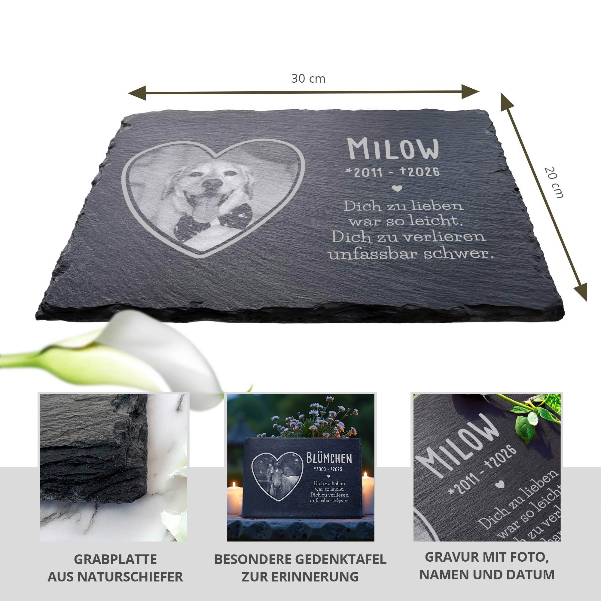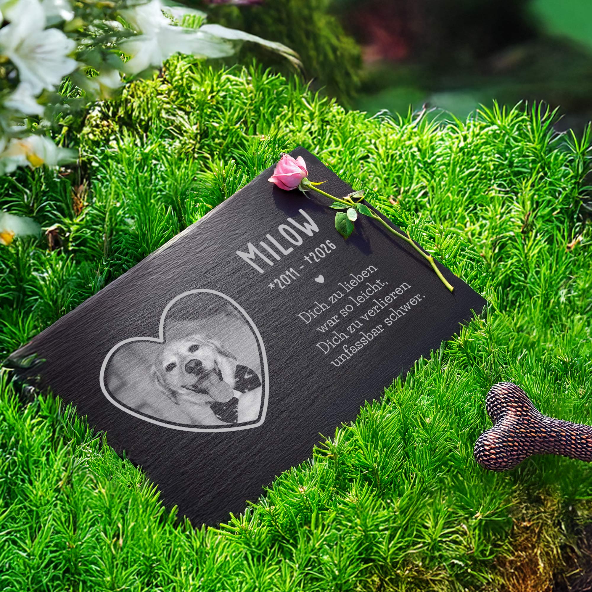 Wenn ein geliebtes Haustier geht, bleibt eine tiefe Lücke – und ein unvergesslicher Platz im Herzen. Mit dieser hochwertigen Grabplatte aus echtem Schiefer schaffst Du einen würdevollen Ort der Erinnerung. Sie wird mit dem Namen, den Lebensjahren und dem einfühlsamen Spruch "Dich zu lieben war so leicht, Dich zu verlieren unfassbar schwer" graviert – dauerhaft und wetterfest.