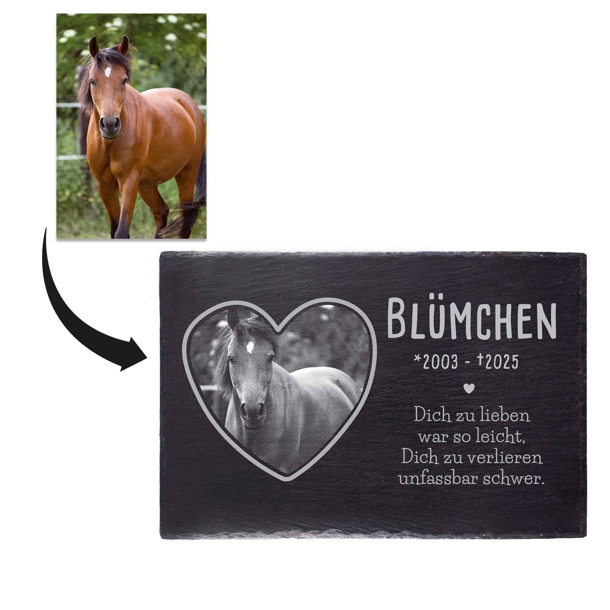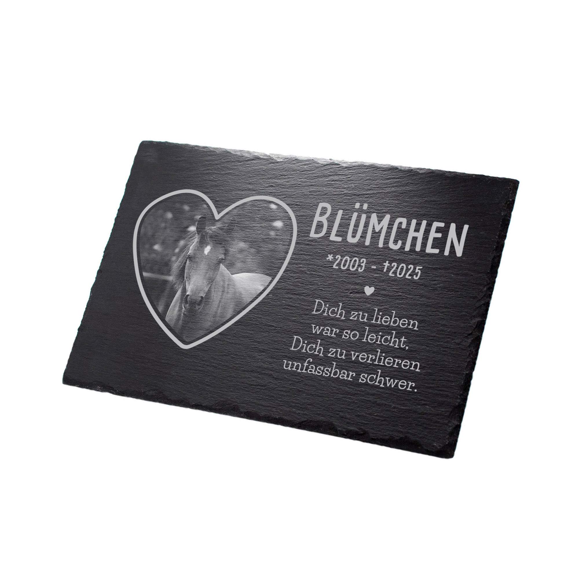 Besonders persönlich wird die Gedenktafel durch das integrierte Foto in Herzform, das direkt ins Schiefermaterial eingebettet wird. Dank des neutralen Designs eignet sich die Platte nicht nur für Hunde oder Katzen, sondern ebenso für Kaninchen, Pferde, Meerschweinchen oder andere treue Seelen. Ohne Loch oder Kordel lässt sich die Platte flexibel aufstellen oder anlehnen – drinnen wie draußen.