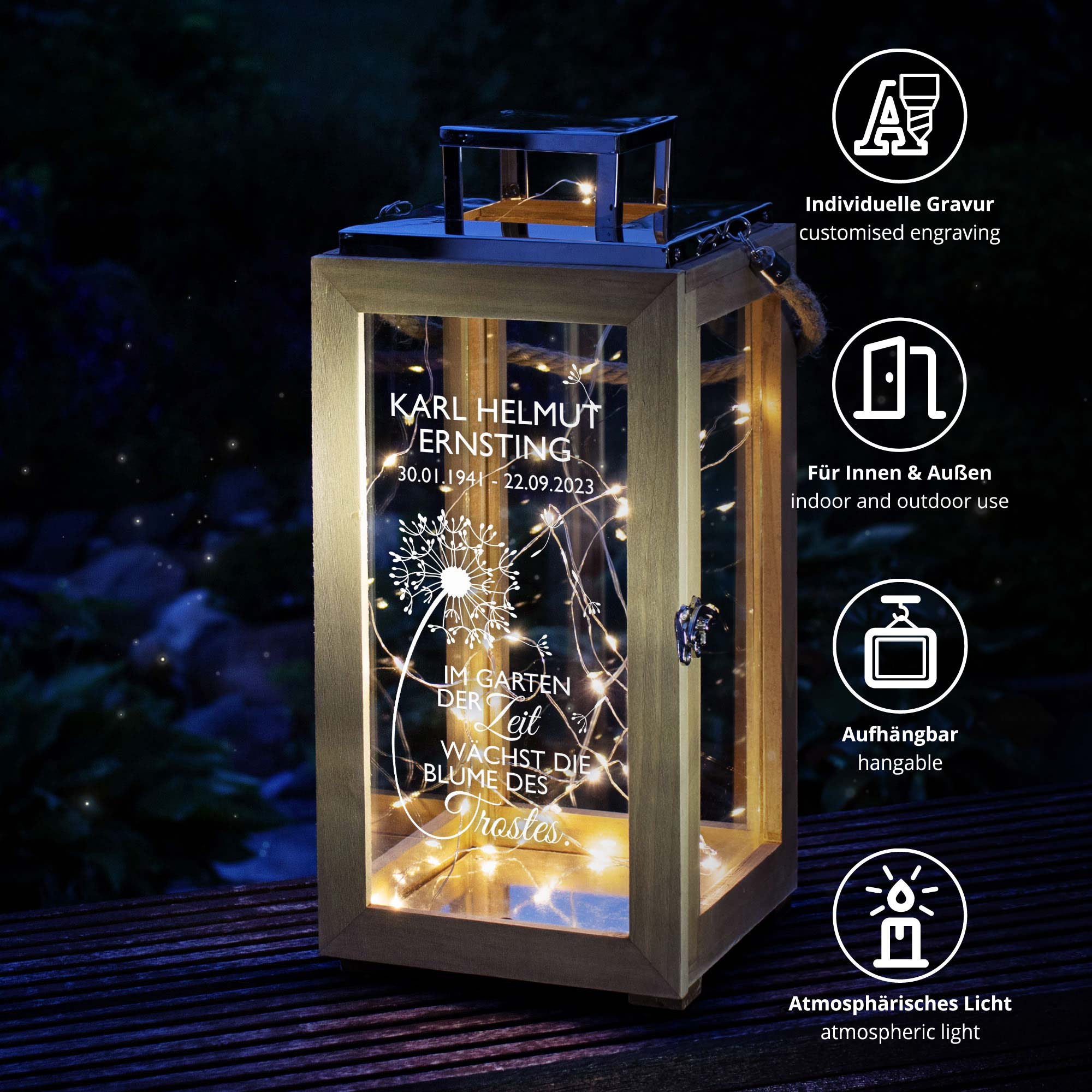 Diese hochwertige Grablaterne mit individueller Gravur ist ein stilles, warmes Licht für die Erinnerung. Auf der Glasfläche befindet sich ein fein graviertes Pusteblumenmotiv sowie der tröstliche Spruch "Im Garten der Zeit wächst die Blume des Trostes". Die Gravur wird durch Namen und Lebensdaten ergänzt und verleiht der Trauerlaterne eine ganz persönliche Note.