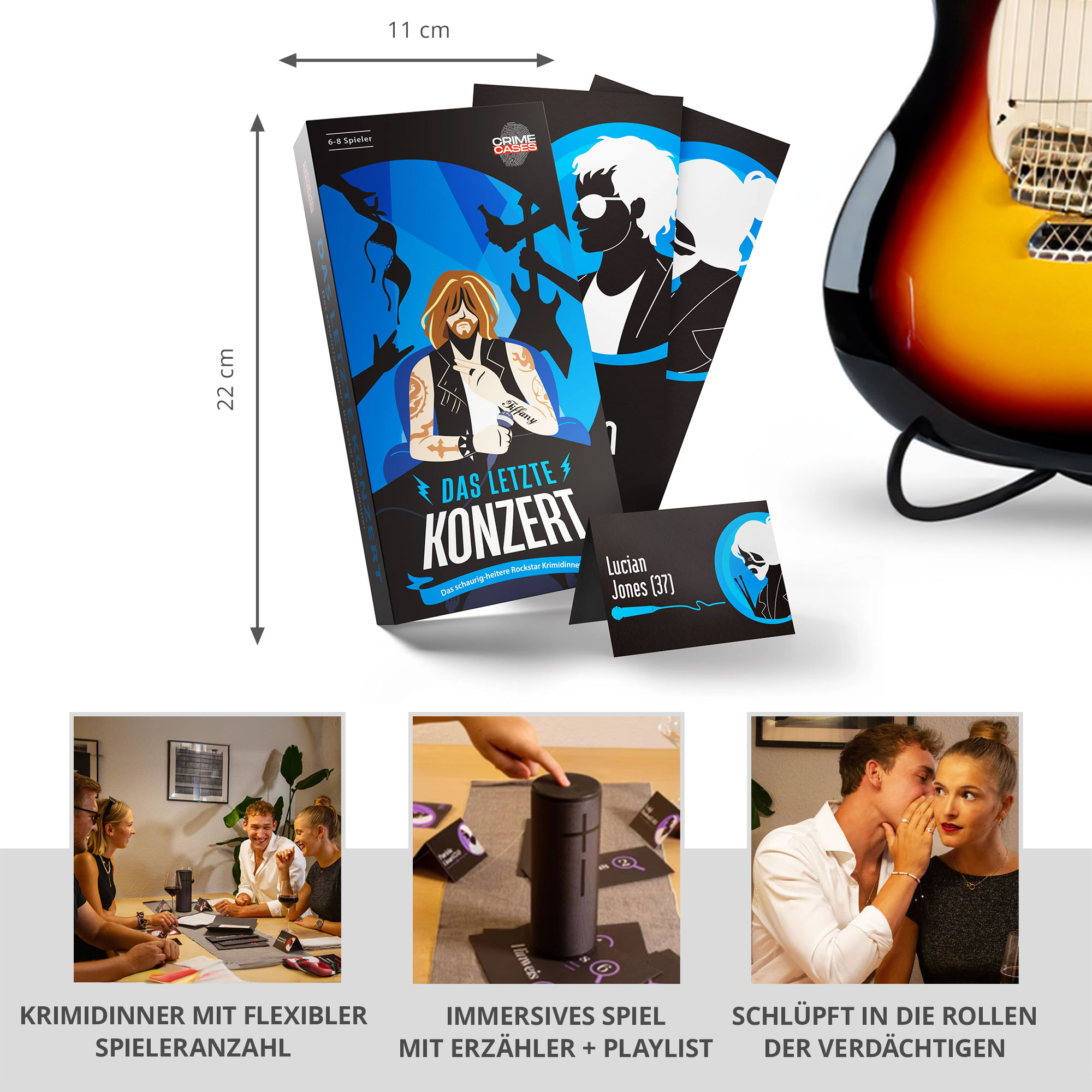Backstage wird’s tödlich: Die Rockband Of Man and Snakes steht kurz vor dem größten Konzert ihrer Karriere – doch dann liegt plötzlich ihr Frontmann tot im Backstagebereich. Jetzt seid Ihr gefragt! Beim Krimidinner Das letzte Konzert schlüpft Ihr in die Rollen von Bandmitgliedern, Managern und Fans, verfolgt Intrigen und deckt dunkle Geheimnisse der Musikszene auf.