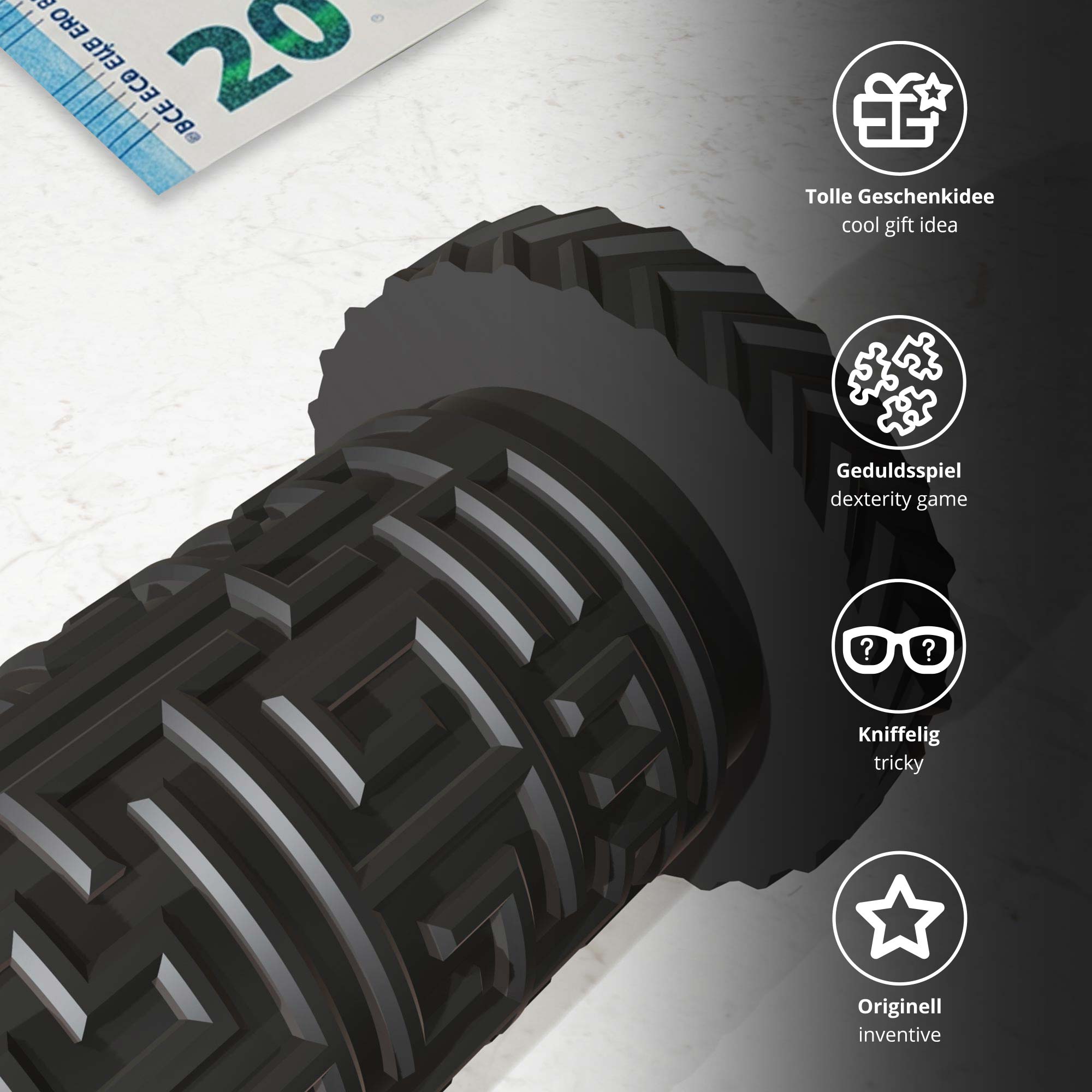 Die Labyrinthbox Röhre in Schwarz bringt Abwechslung in klassische Geschenkverpackungen und macht schon das Öffnen selbst zum Highlight. Statt den Inhalt sofort freizugeben, wartet zunächst eine kleine Herausforderung: Erst wenn das integrierte Labyrinth erfolgreich gemeistert wurde, lässt sich das versteckte Fach öffnen.