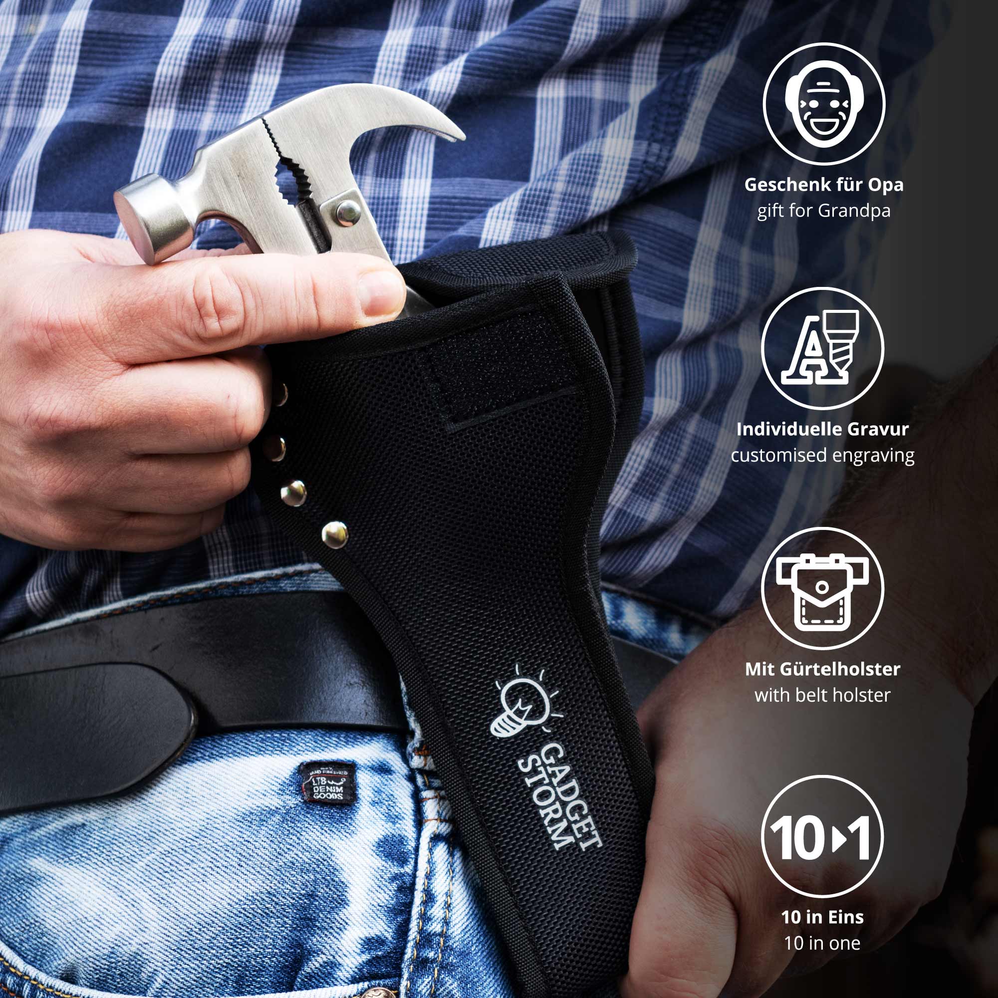 Das Multitool ist dabei das perfekte Gerät für unterwegs. Es enthält 10 verschiedene Werkzeug, unter anderem Hammer, Drahtschneider, Zange, Flaschenöffner, Taschenmesser, Schlitzschraubenzieher, Säge, Reibahle, Feile, Kreuz-Schraubenzieher. Besonders liebevoll wird es durch das Gravur-Motiv "bester Opa" - das noch mit Deinem Wunschnamen ergänzt werden kann. Tolle Geschenkidee für Opa!