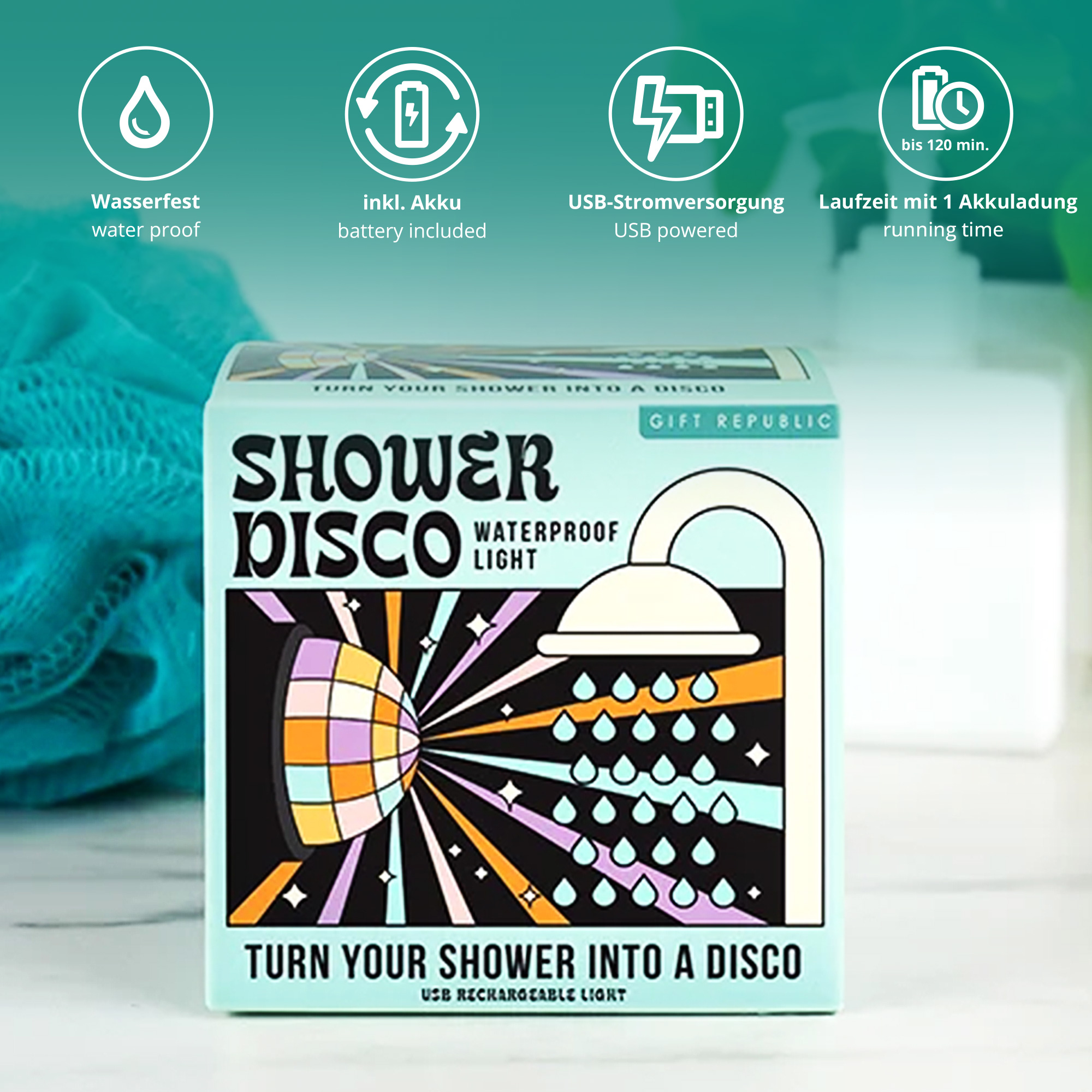 Mit seinen drei Saugnäpfen lässt es sich stabil und sicher in der Dusche befestigen. Die LED-Lichteffekte rotieren im Takt, ganz egal, ob Du leise mitsummst oder laut mitsingst. Dank der wiederaufladbaren Batterie bleibst Du kabellos – und kabellos cool. Das perfekte Geschenk für alle, die das Leben feiern – schon vor dem ersten Kaffee!