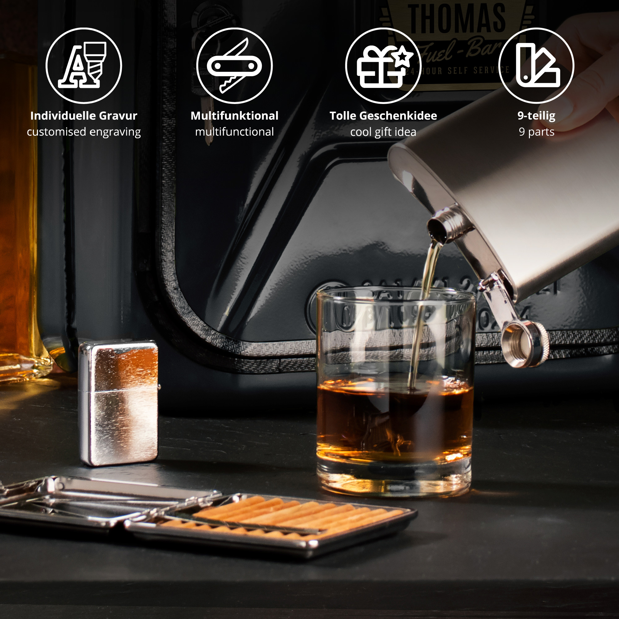 • Inklusive 8 Zubehörteilen: 2 Gläser, Flachmann (200 ml), Etui, Feuerzeug, Kellnermesser, Flaschenverschluss, Ausgießer