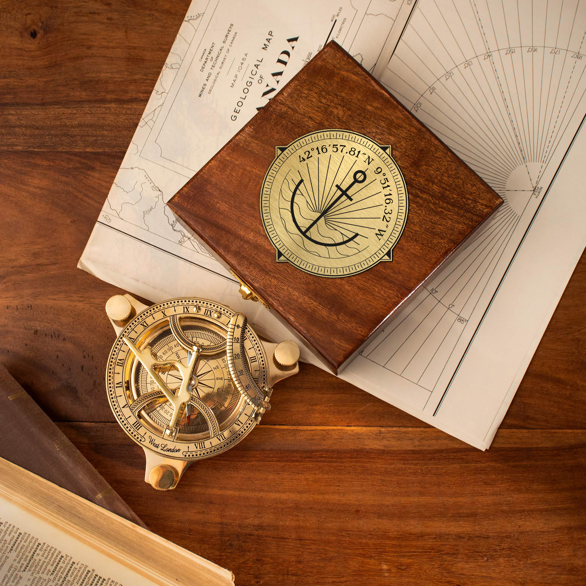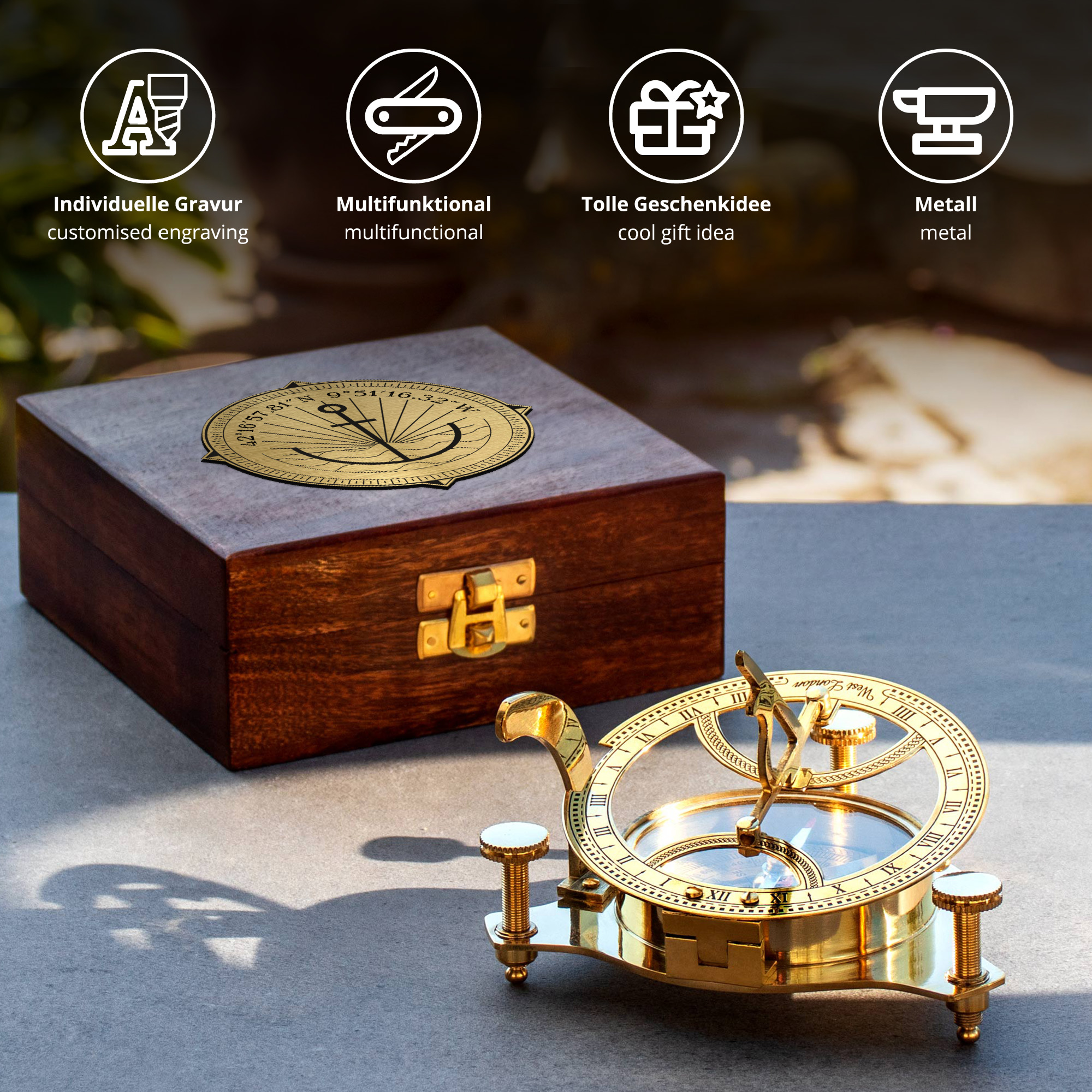 Ein echter Hingucker mit Funktion: Diese edle Sonnenuhr mit integriertem Kompass vereint maritimes Flair und klassisches Abenteuergefühl. Auf der passenden Holzbox prangt ein stilisiertes Anker-Motiv mit eingravierten Geokoordinaten – ein besonderes Detail, das dieses Stück zu einem echten Unikat macht.