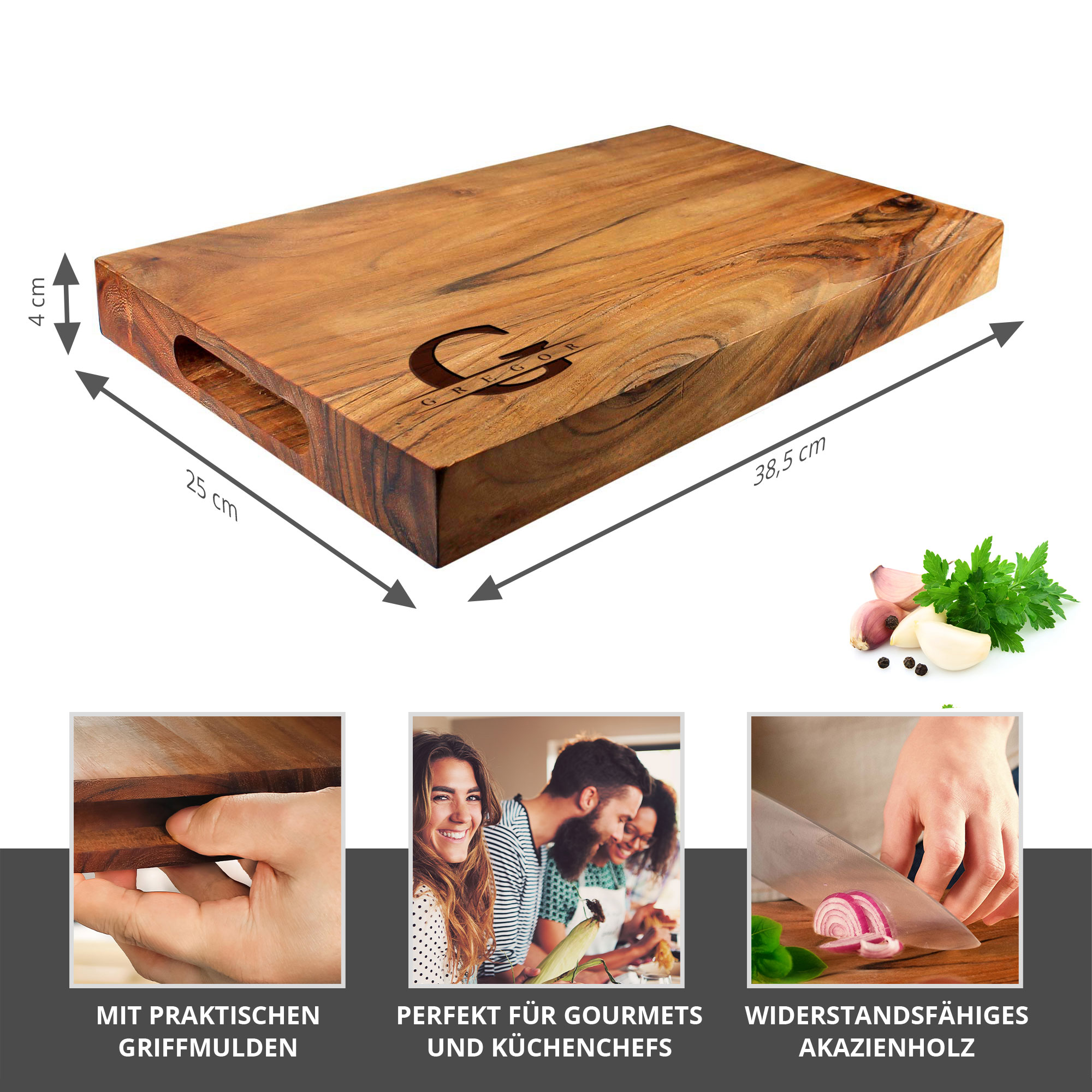 • Schneidebrett mit praktischer Griffmulde und Gravur