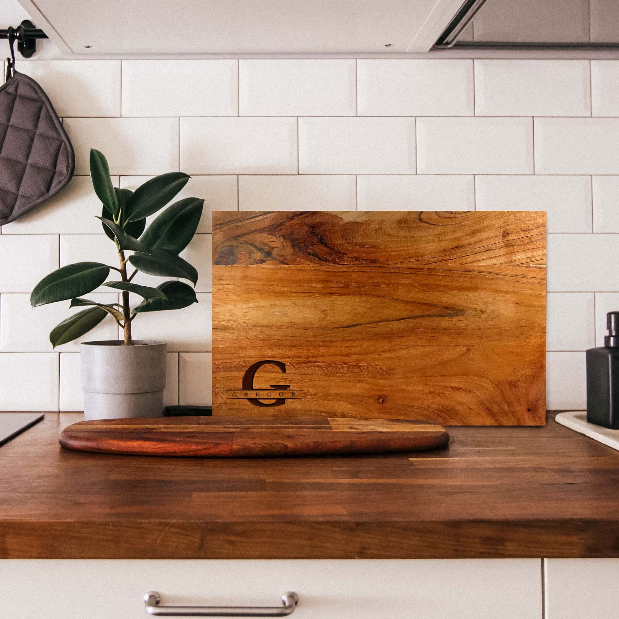 Die Kombination aus Initial und Name verleiht diesem Schneideblock eine besonders elegante Note. Das minimalistische Design wirkt modern und zeitlos zugleich – perfekt für alle, die es schlicht und hochwertig mögen.