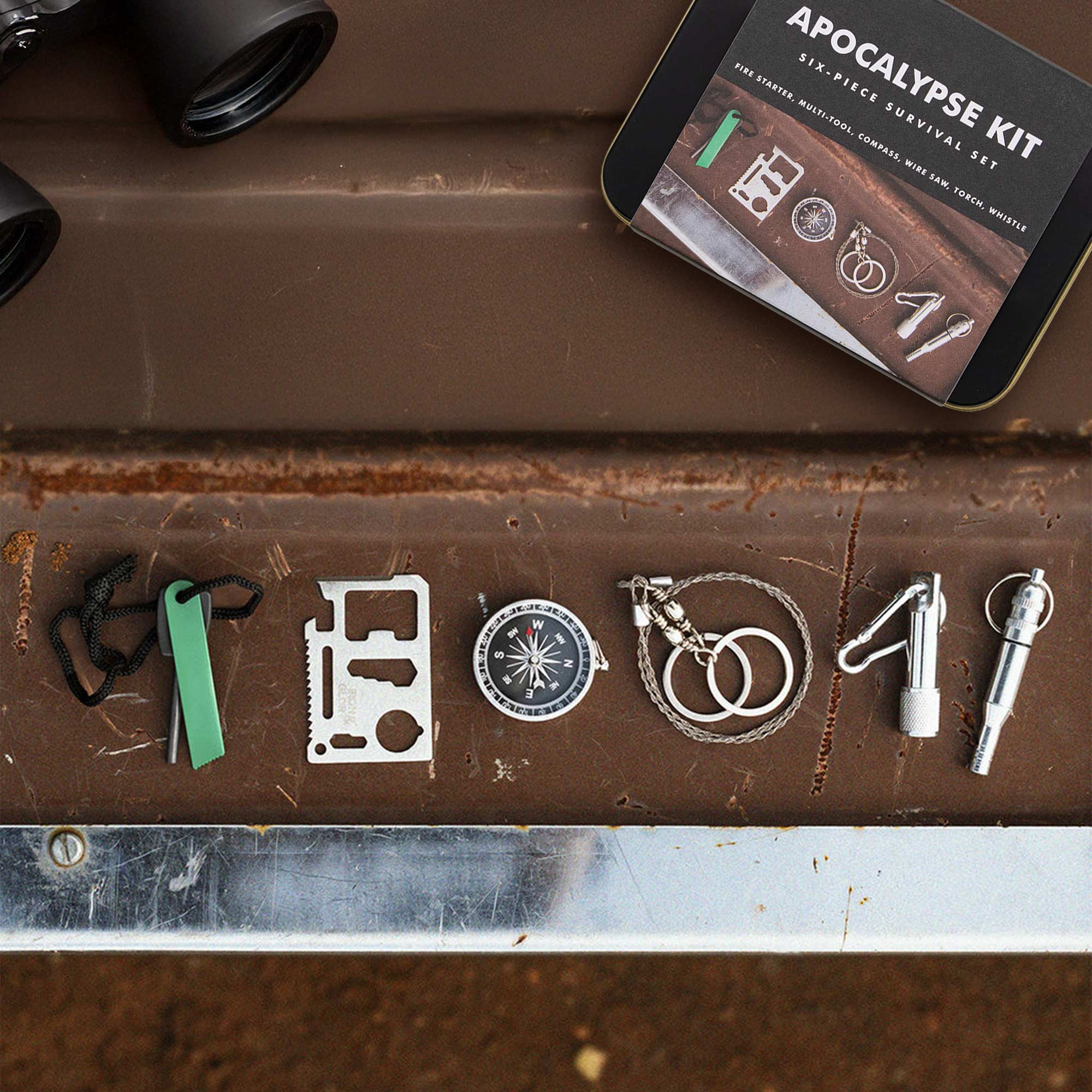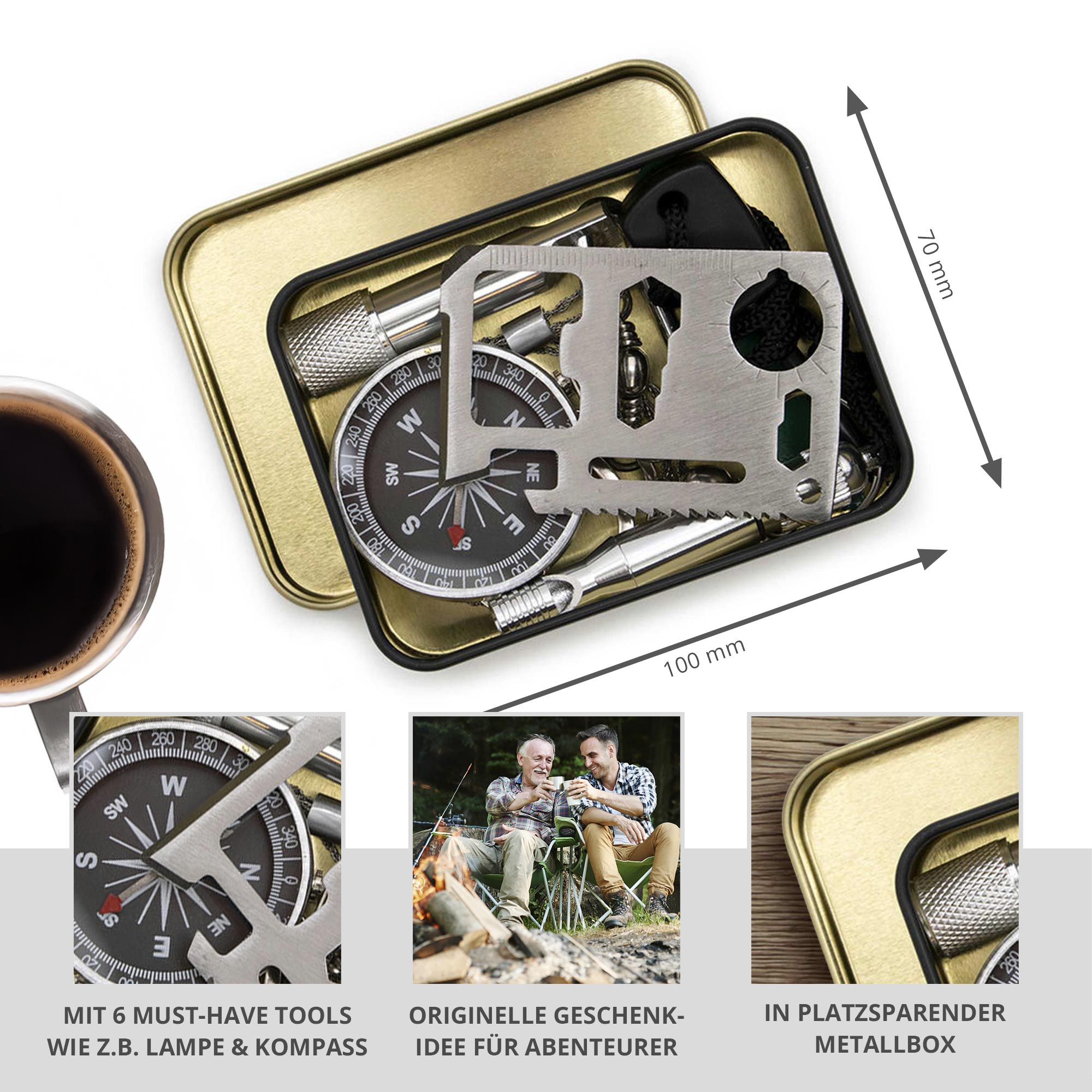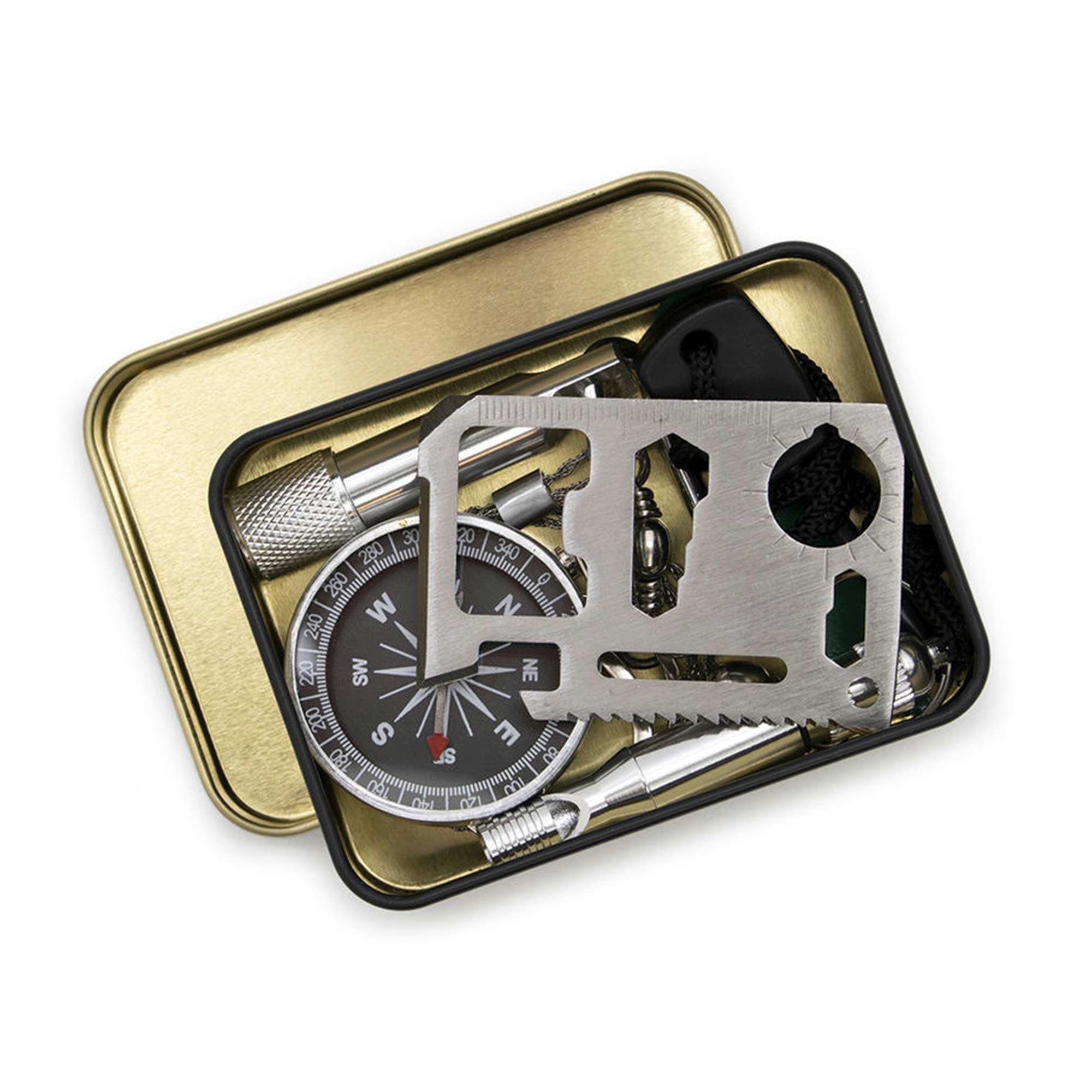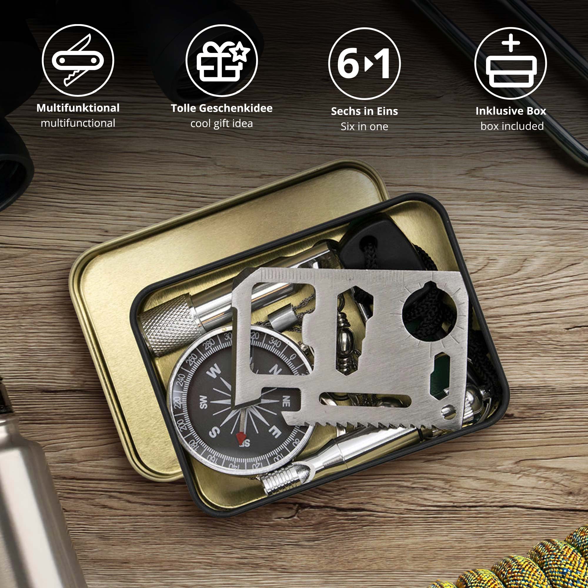 Ob Du nun durch den Wald wanderst oder auf dem Weg zum Festival bist – mit Kompass, Signalpfeife, Mini-Taschenlampe, Drahtsäge, Multitool und Feuerstahl bist Du auf jede Situation vorbereitet. Robust verarbeitet und leicht im Gewicht passt das Set locker in den Rucksack oder sogar in die Jackentasche. Ein geniales Geschenk für Prepper, Outdoor-Fans oder alle, die auf abgefahrene Gadgets stehen!