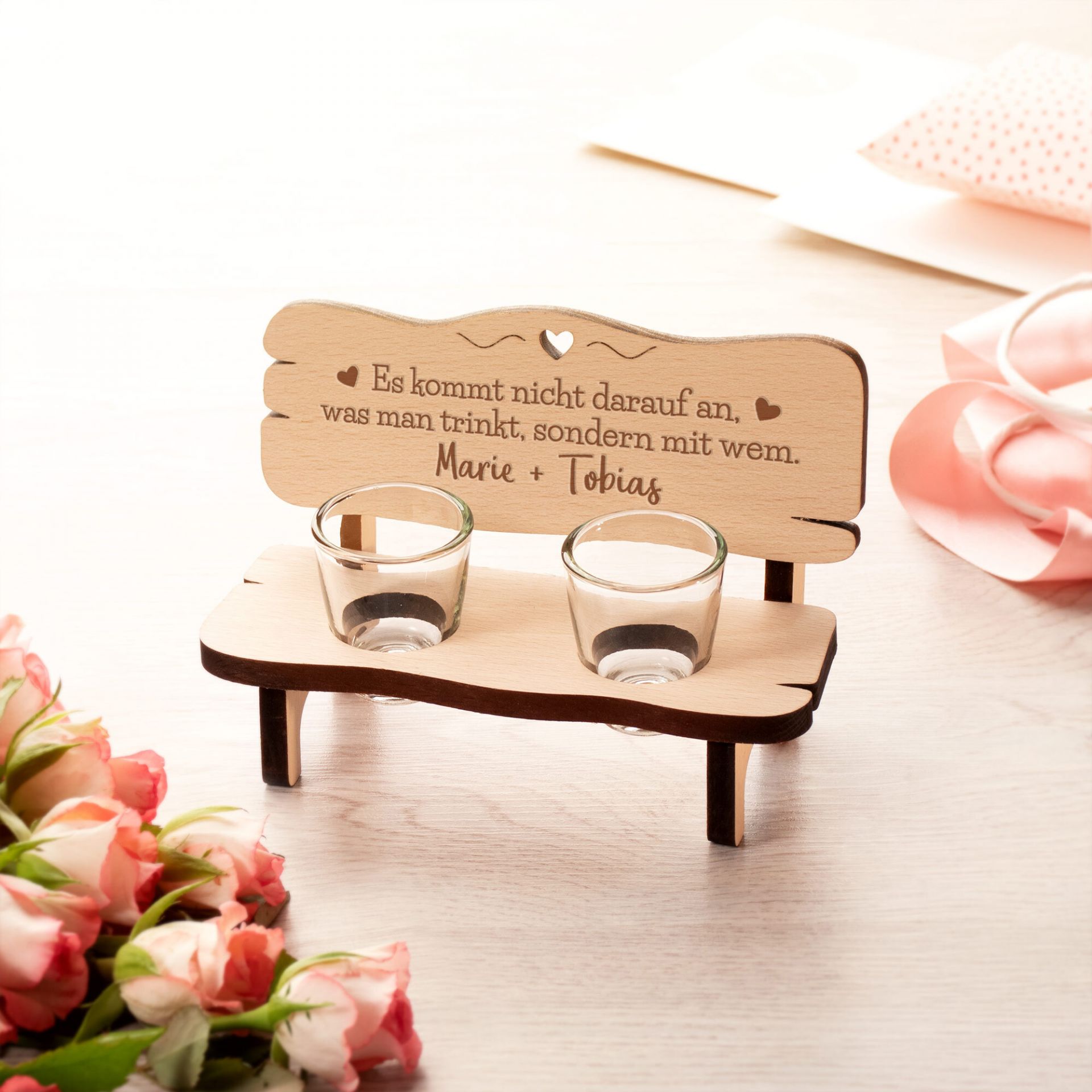 Gefertigt aus Holz im rustikalen Look und versehen mit dem beliebten Trinkspruch, wird die Schnapsbank durch die individuelle Gravur mit Namen zu einem ganz persönlichen Geschenk. Ob für Paare, beste Freunde oder als kleine Aufmerksamkeit zwischendurch – dieses Set sorgt garantiert für gemeinsame Genussmomente.