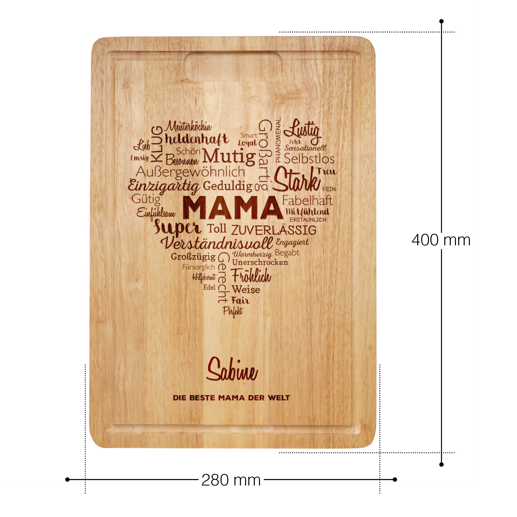 Das beste an dem gravierten Brett ist allerdings die Gravur. In Form eines Herzens sind schöne Komplimente für die Mutter eingraviert. Auf Wunsch kann darunter auch der Name der Mutter graviert werden. Ein tolles Unikat also, das nicht nur praktisch ist, sondern auch ein liebevolles Geschenk für Mütter - perfekt geeignet als Geschenk zum Muttertag oder auch zum Geburtstag.