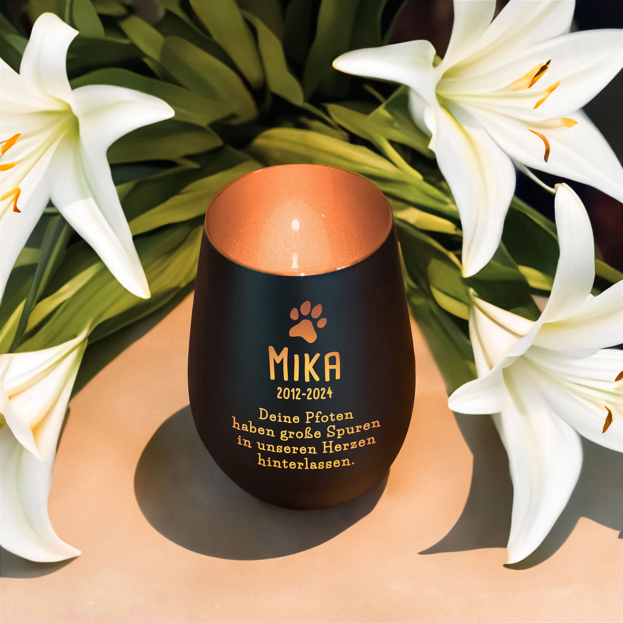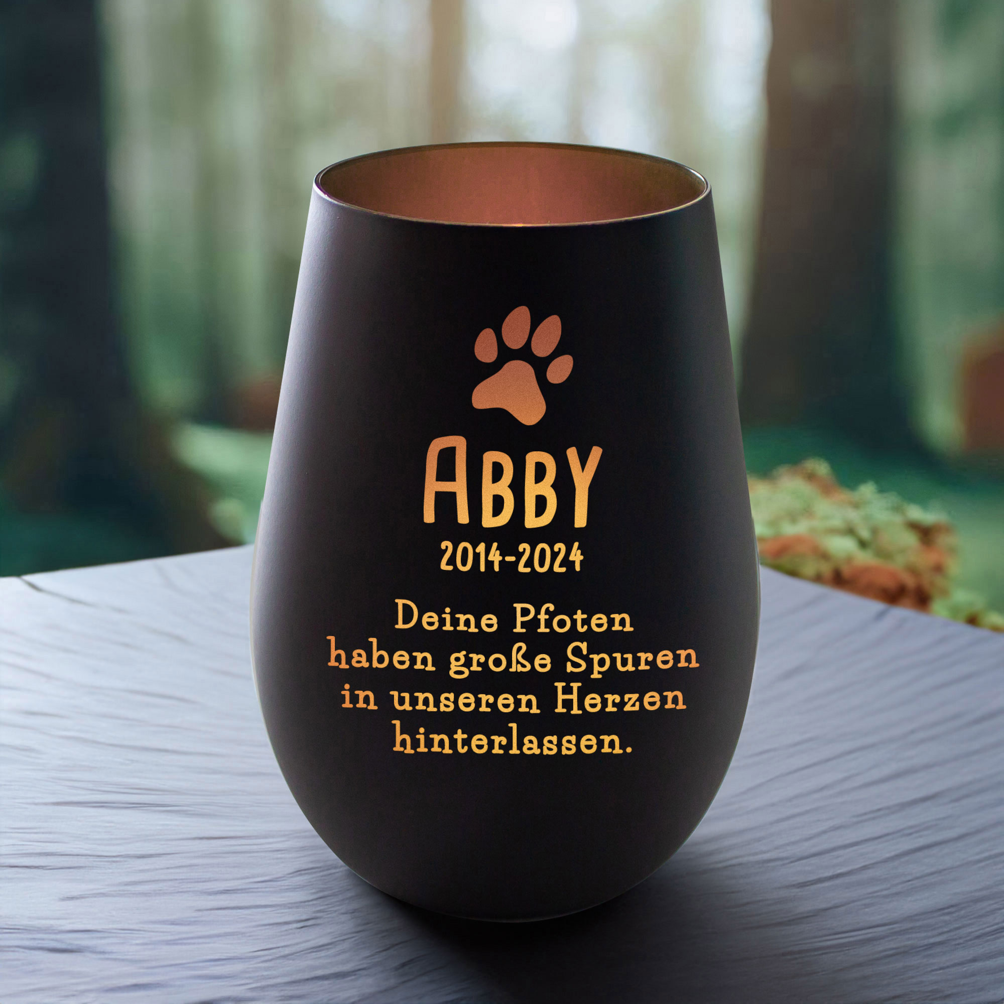 Wenn ein Hund geht, bleibt mehr als nur Stille zurück – ein Stück Deines Herzens nimmt der geliebte Vierbeiner mit. Dieser Teelichthalter in Schwarz mit bronzefarbener Innenfläche erinnert auf würdige Weise an Deinen tierischen Gefährten. Der eingravierte Spruch - Deine Pfoten haben große Spuren in unseren Herzen hinterlassen - ergänzt um Name, Jahreszahlen und Pfoten Motiv, macht das Erinnerungslicht zu einem einzigartigen Symbol der Verbundenheit. Die Bronze-Innenbeschichtung sorgt für sanftes Licht, das Wärme und Trost spendet. Ein stilles Trostlicht, das für alles steht, was bleibt – für Dich oder als persönliches Geste der Anteilnahme an trauernde Hundeliebhaber.