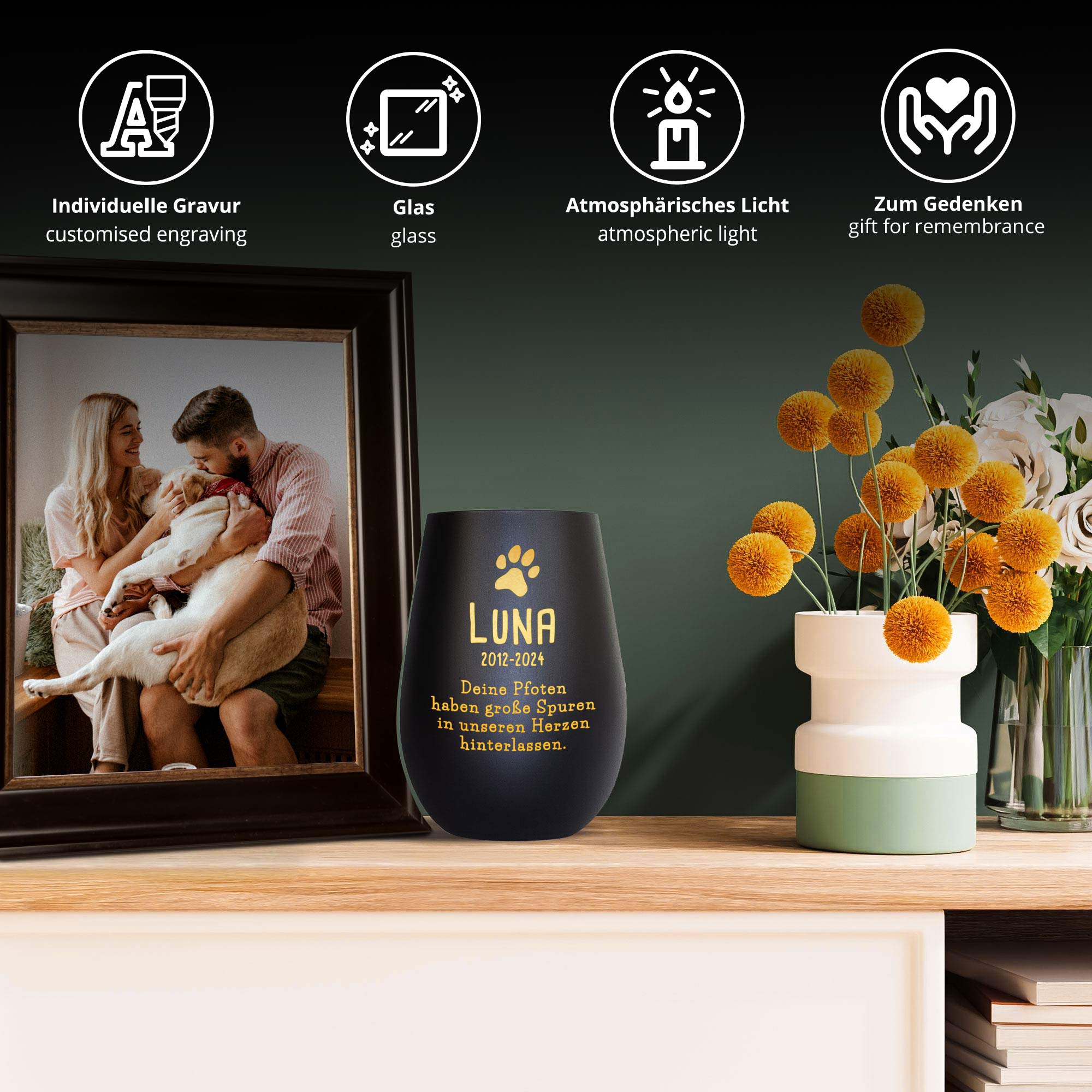 Die gravierte Pfote als Motiv steht für Treue und unvergessliche Momente. Das Licht, das durch die goldfarbene Innenbeschichtung reflektiert wird, sorgt für eine beruhigende Atmosphäre. Ein persönliches Erinnerungslicht und ein wertvoller Begleiter auf dem Weg des Gedenkens – für Dich selbst oder als aufrichtiges Trostgeschenk an trauernde Tierfreunde.