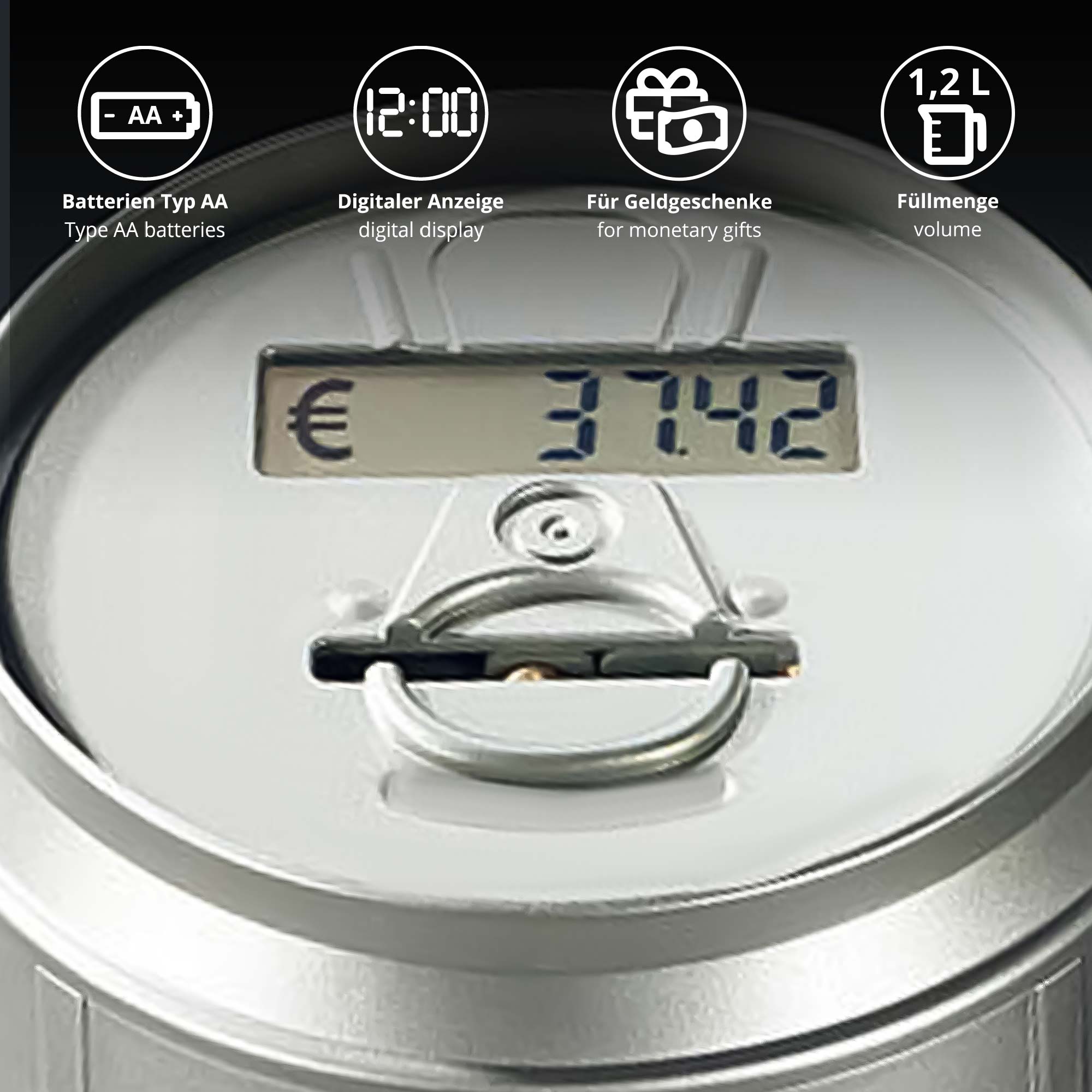 Deine Spardose besitzt ein elektronisches Zählwerk, das Münzen im Wert von einem Cent bis hin zu einem zwei Euro Stück erkennen kann. Jetzt kannst Du dank der automatischen Münzerkennung direkt auf einen Blick im Display erkennen, wie groß Dein angesparter Geldbetrag bereits ist. Die mitzählende Spardose ist ein tolles Geldgeschenk zum Geburtstag, bei dem Du bereits eine erste Münze einwerfen kannst.