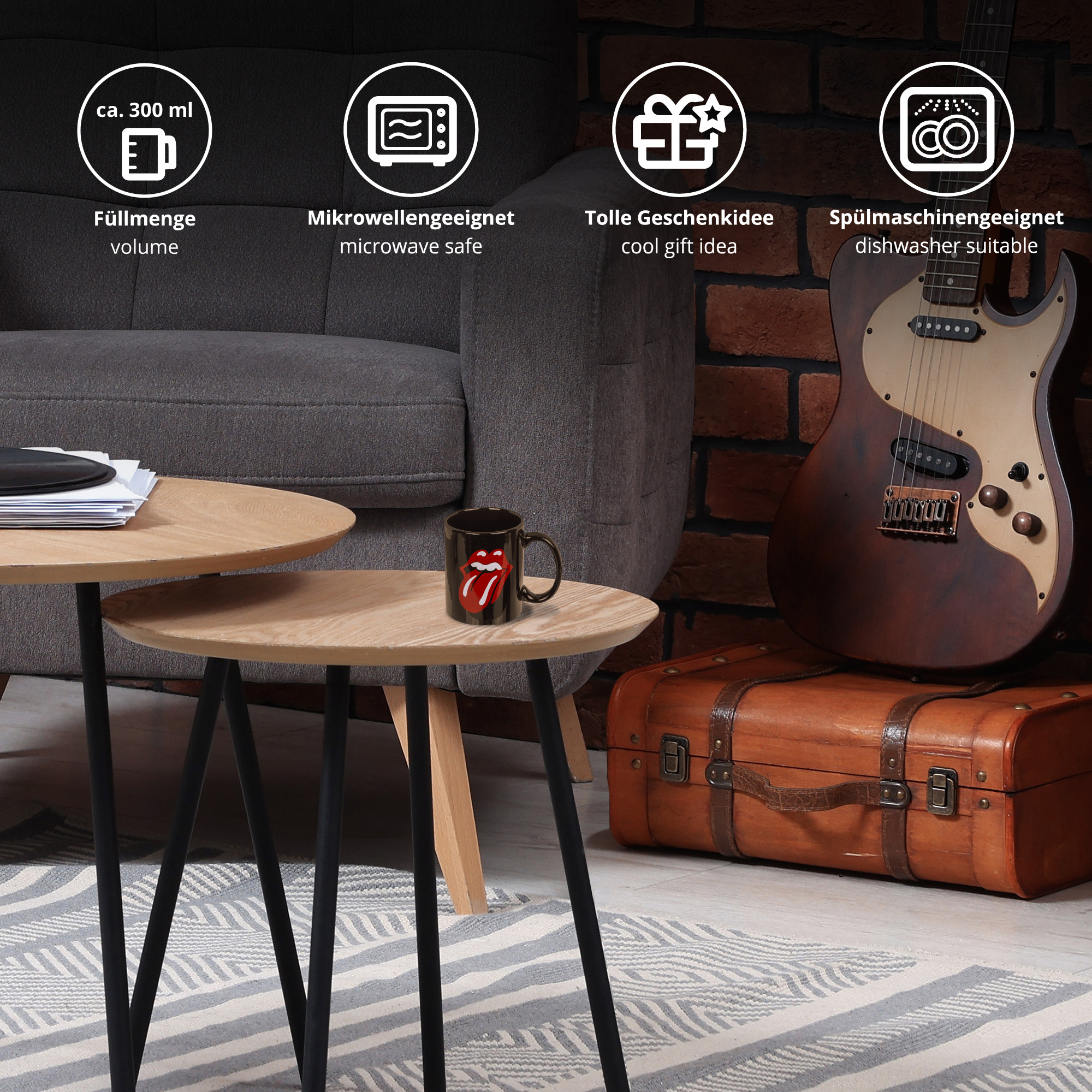 Rock your morning! Mit dem Geschenkset "The Rolling Stones" bringst Du stilechten Sound in Deine Kaffeepause – und das direkt von den Bühnen der Rockgeschichte. Die schwarze Keramiktasse mit dem legendären roten Zungen-Logo ist ein echter Hingucker auf jedem Schreibtisch. Dazu gibt’s passende Socken in Größe 41-45 – natürlich auch mit ikonischem Design und extra bequemem Materialmix.