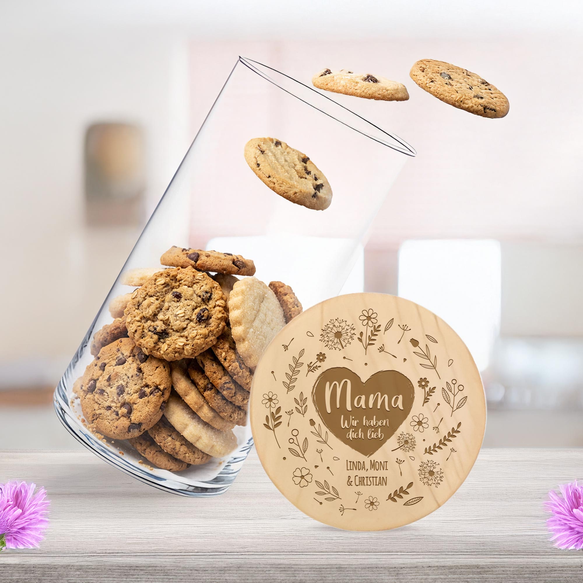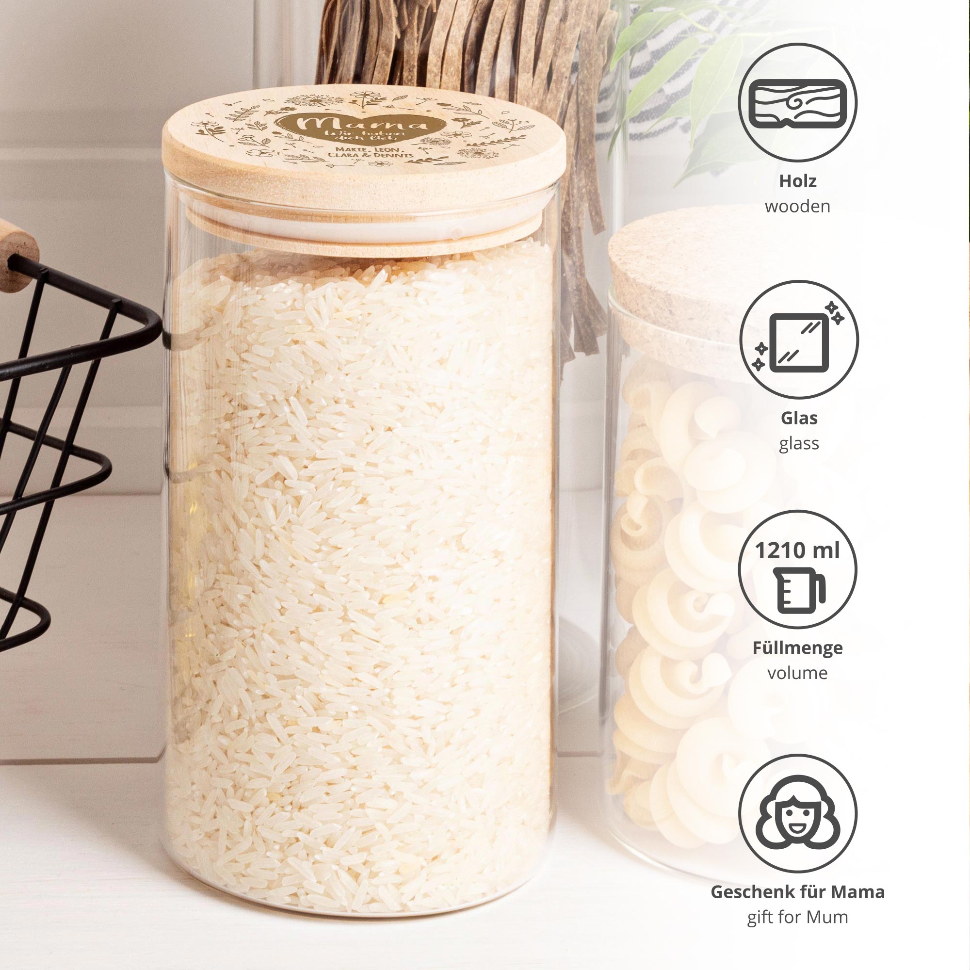 Ob für Kekse, Mehl, Nudeln oder einfach als hübsche Aufbewahrung – dieses personalisierte Vorratsglas bringt Herz in Mamas Küche. Der Holzdeckel ist mit einem liebevollen Blumenherz graviert, mittendrin stehen die Namen der Schenkenden. Mit 1210 ml Fassungsvermögen ist es nicht nur ein Hingucker, sondern auch super praktisch. Ideal als Geschenk zum Muttertag, Geburtstag oder einfach zwischendurch, um Danke zu sagen.