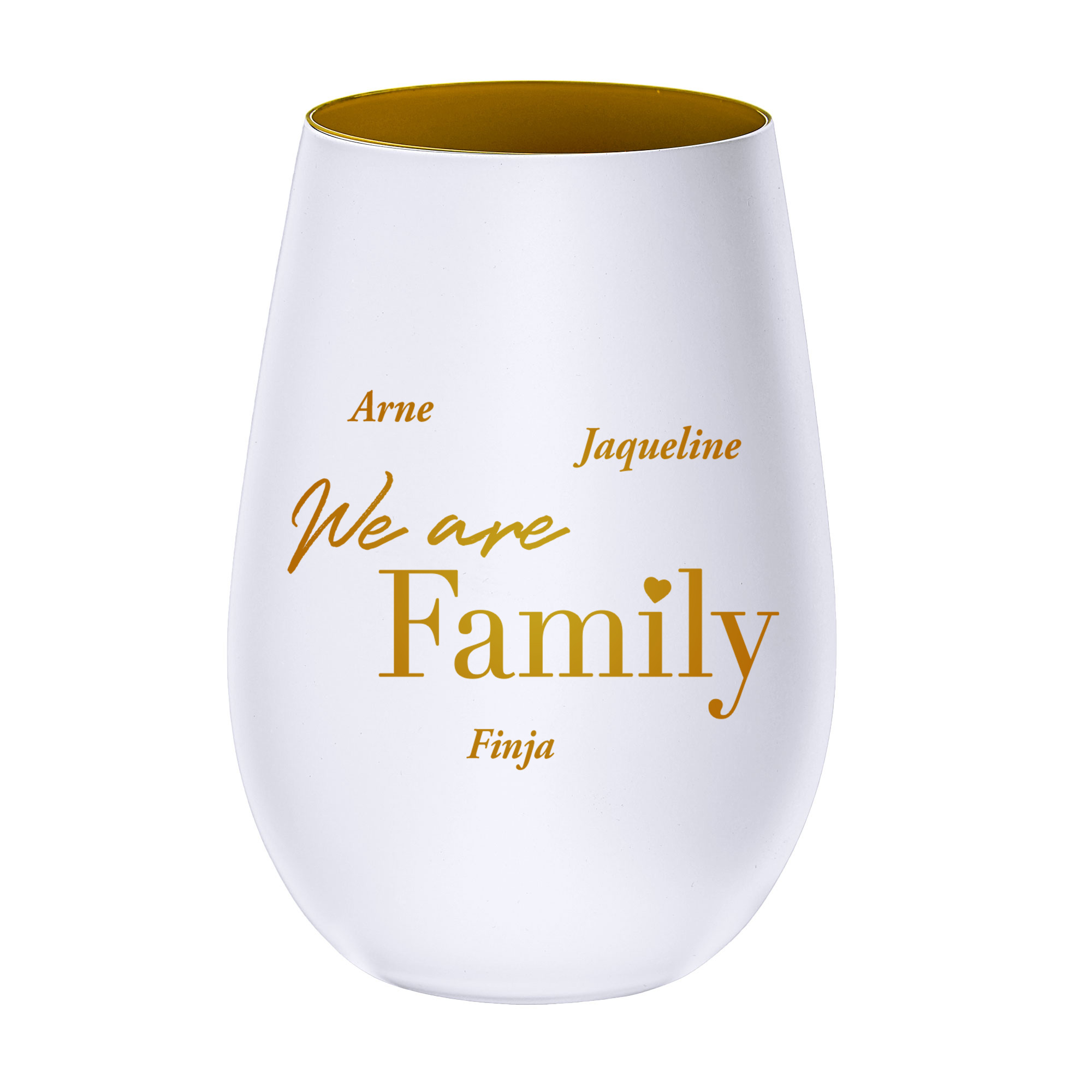 • Modernes Windlicht in Weiß mit goldener "We are Family"-Gravur