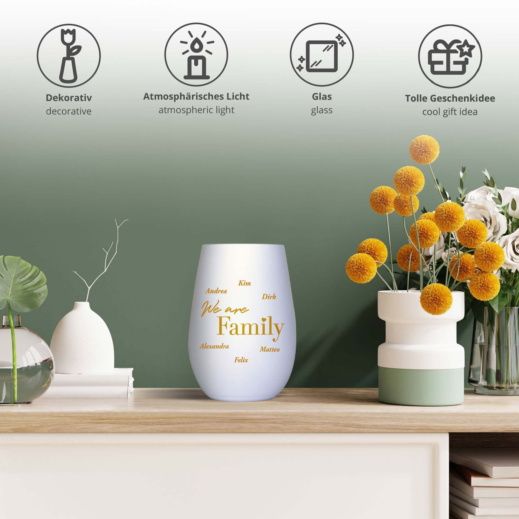 Die Namen der Familienmitglieder werden individuell eingraviert und machen jedes Windlicht zu einem echten Unikat. Ob auf dem Tisch, im Regal oder als Geschenk – dieses Design zieht alle Blicke auf sich.