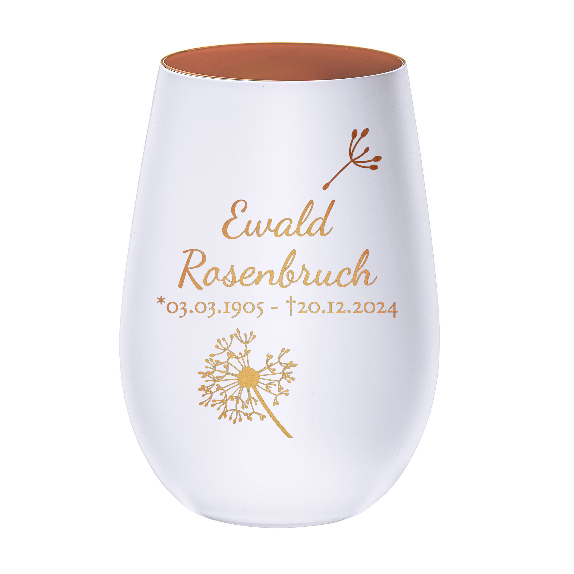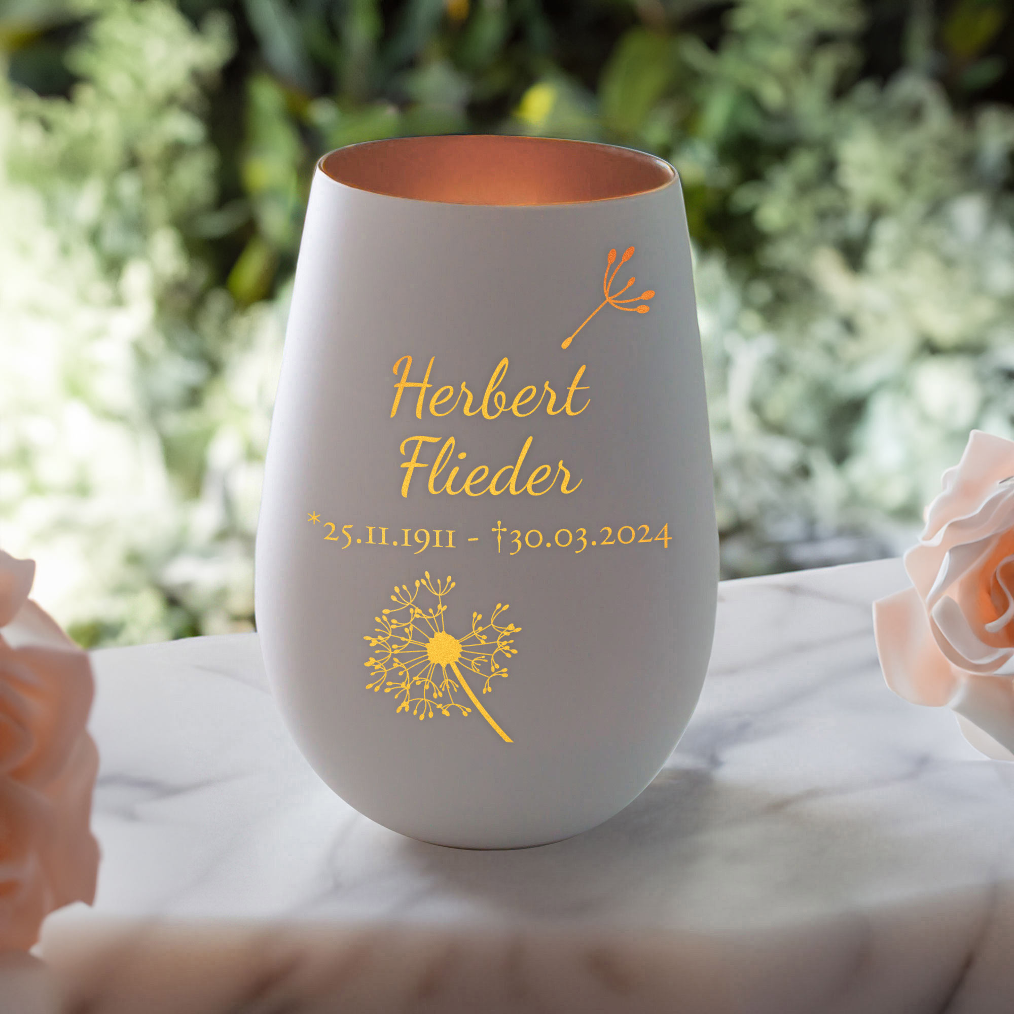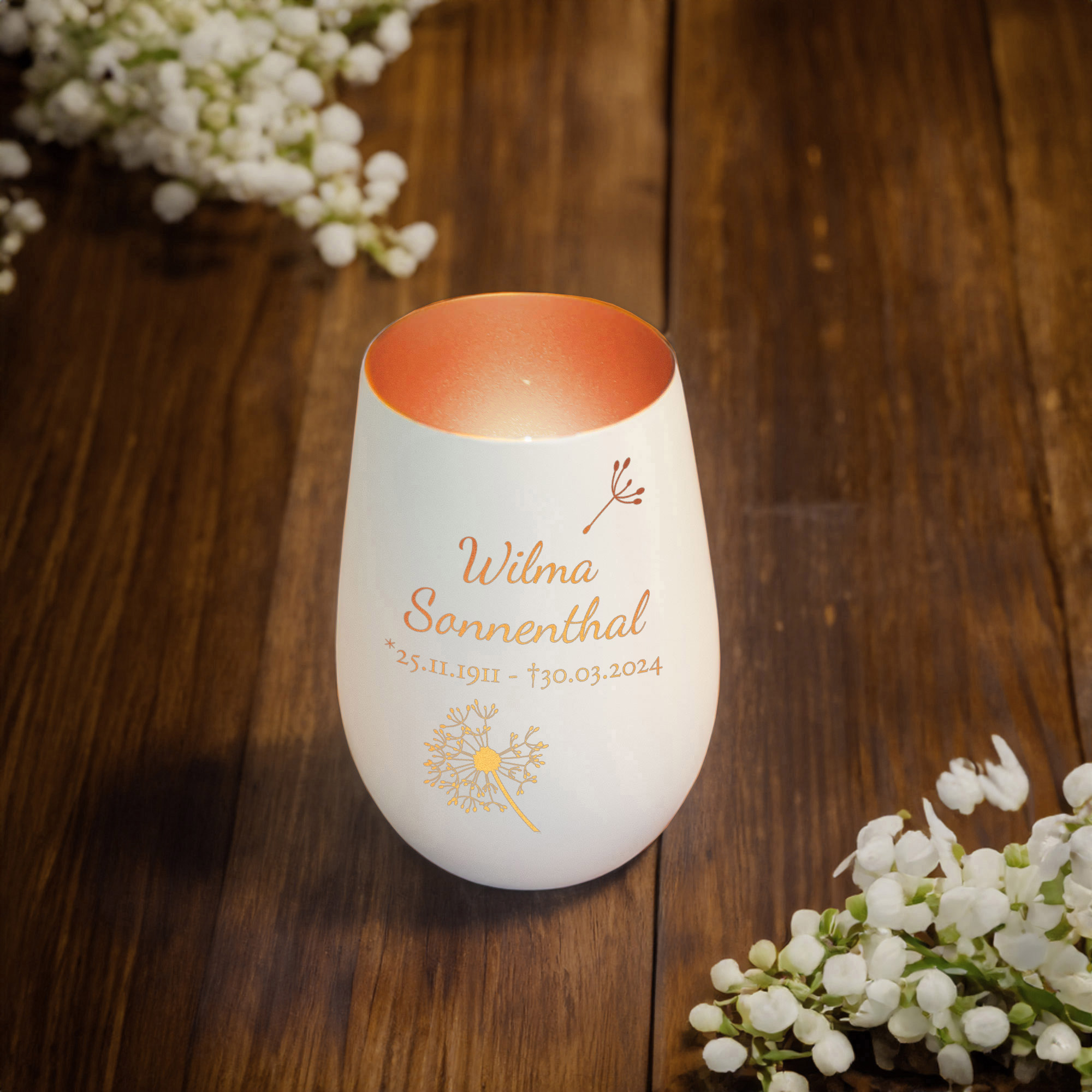 Ein Licht, das Erinnerungen bewahrt: Dieses weiße Trostlicht mit Pusteblumen-Gravur bietet einen würdevollen Weg, an einen geliebten Menschen zu erinnern. Die bronzefarbene Innenfläche reflektiert das Kerzenlicht besonders sanft und schafft eine Atmosphäre der Ruhe und Verbundenheit. Die filigran gravierte Pusteblume steht als Zeichen für Vergänglichkeit und bleibende Liebe.
