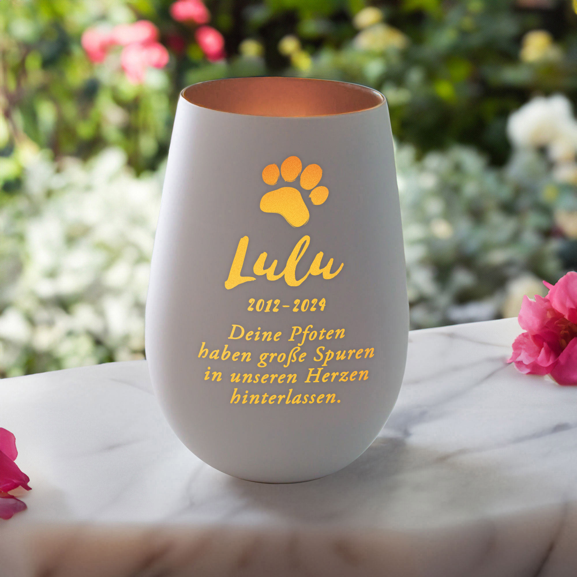 Wenn eine geliebte Katze geht, bleiben viele Erinnerungen an die gemeinsame Zeit. Dieser Kerzenlichthalter mit weißem Äußeren und bronzefarbener Innenfläche spendet Trost in dieser Zeit der Trauer. Mit dem Namen Deiner Katze, den Lebensdaten und dem liebevollen Spruch “Deine Pfoten haben große Spuren in unseren Herzen hinterlassen” wird es zu einem persönlichen Gedenklicht, das Trost spendet. Die zarte Pfotengravur symbolisiert Nähe, Treue und die feinen Spuren, die Deine Katze in Deinem Leben hinterlassen hat. Das Licht wird sanft durch die bronzefarbene Beschichtung reflektiert und schafft eine ruhige, warme Atmosphäre. Ein einzigartiges Erinnerungslicht – für Dich selbst oder als mitfühlendes Trostgeschenk für jemanden, der Abschied von seiner Samtpfote nehmen musste.