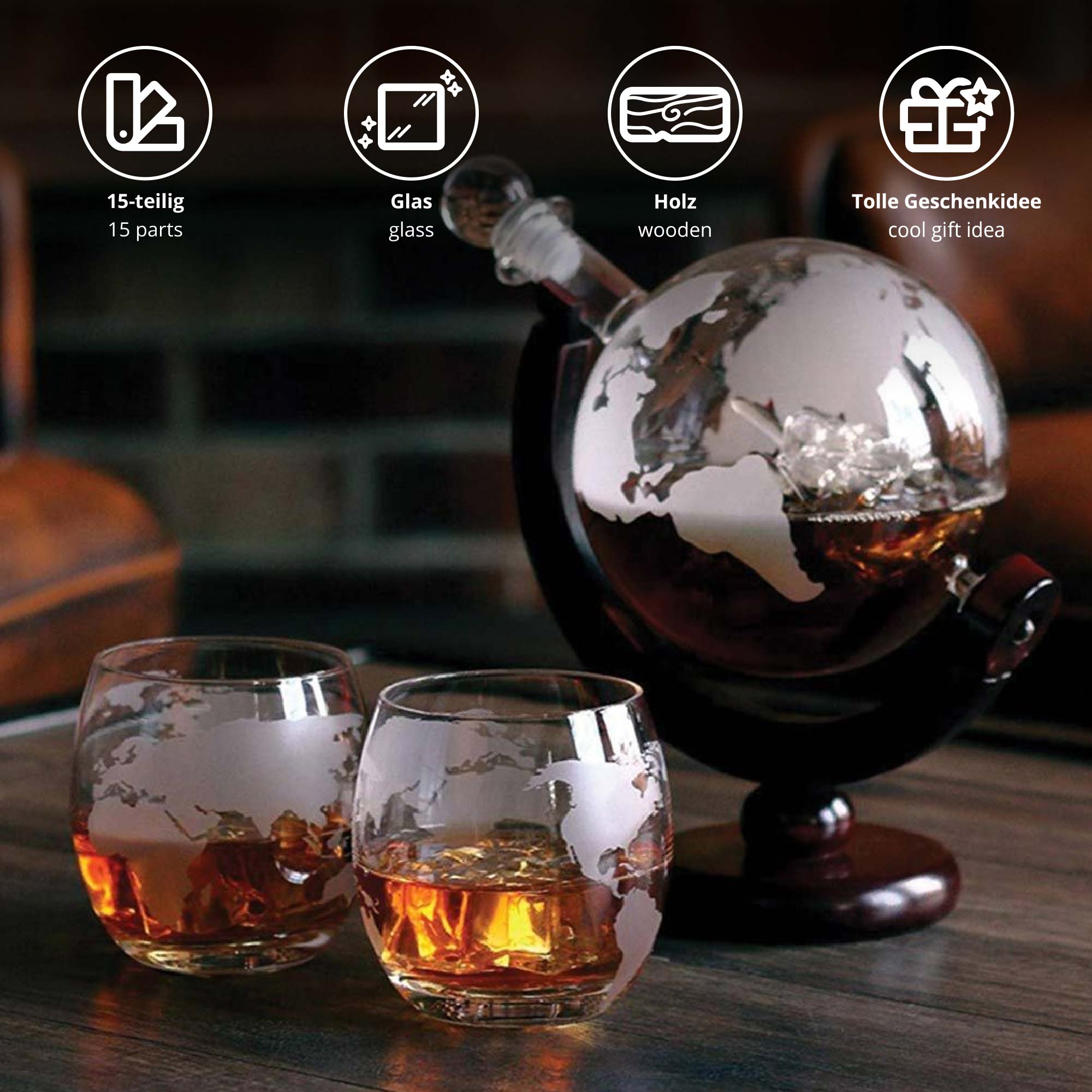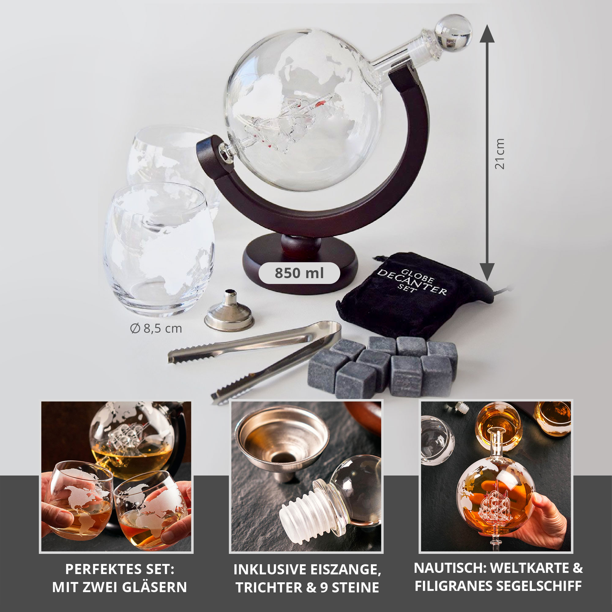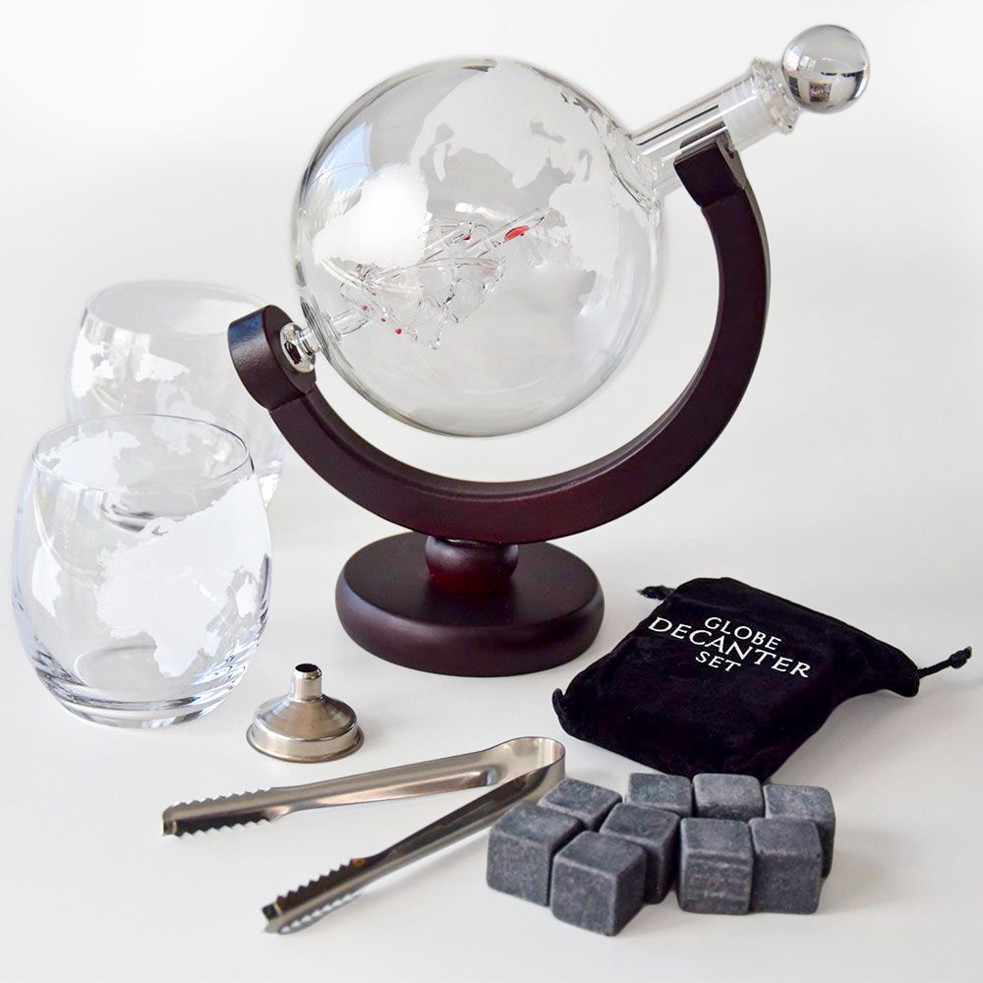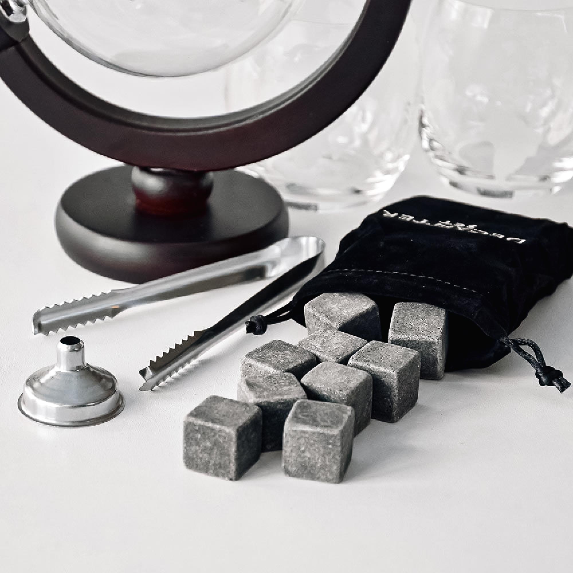 - Inklusive Globus Karaffe mit Ständer, 2 Whisy Gläser, 9 Whisky Steine mit Tasche, Eiszange und Trichter
