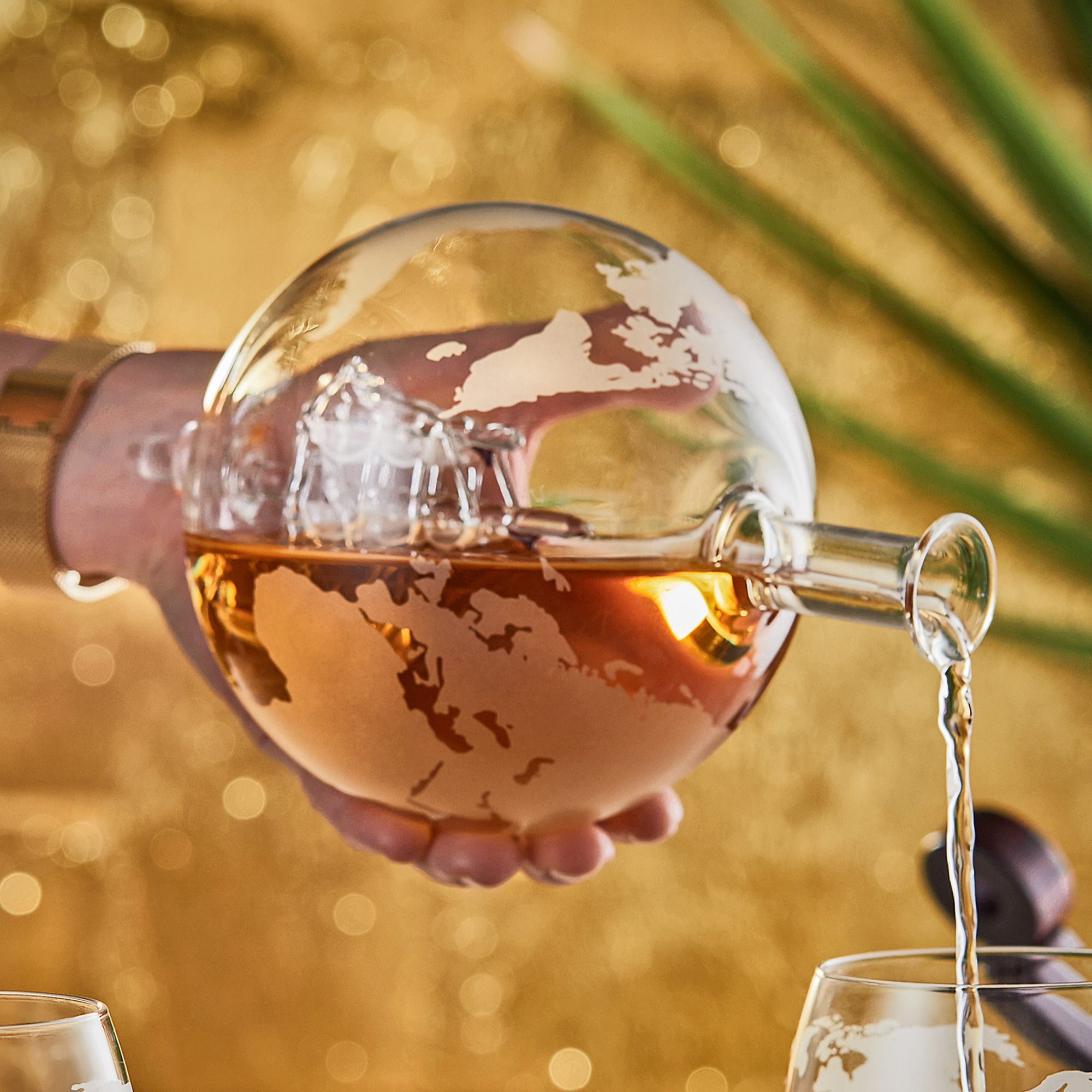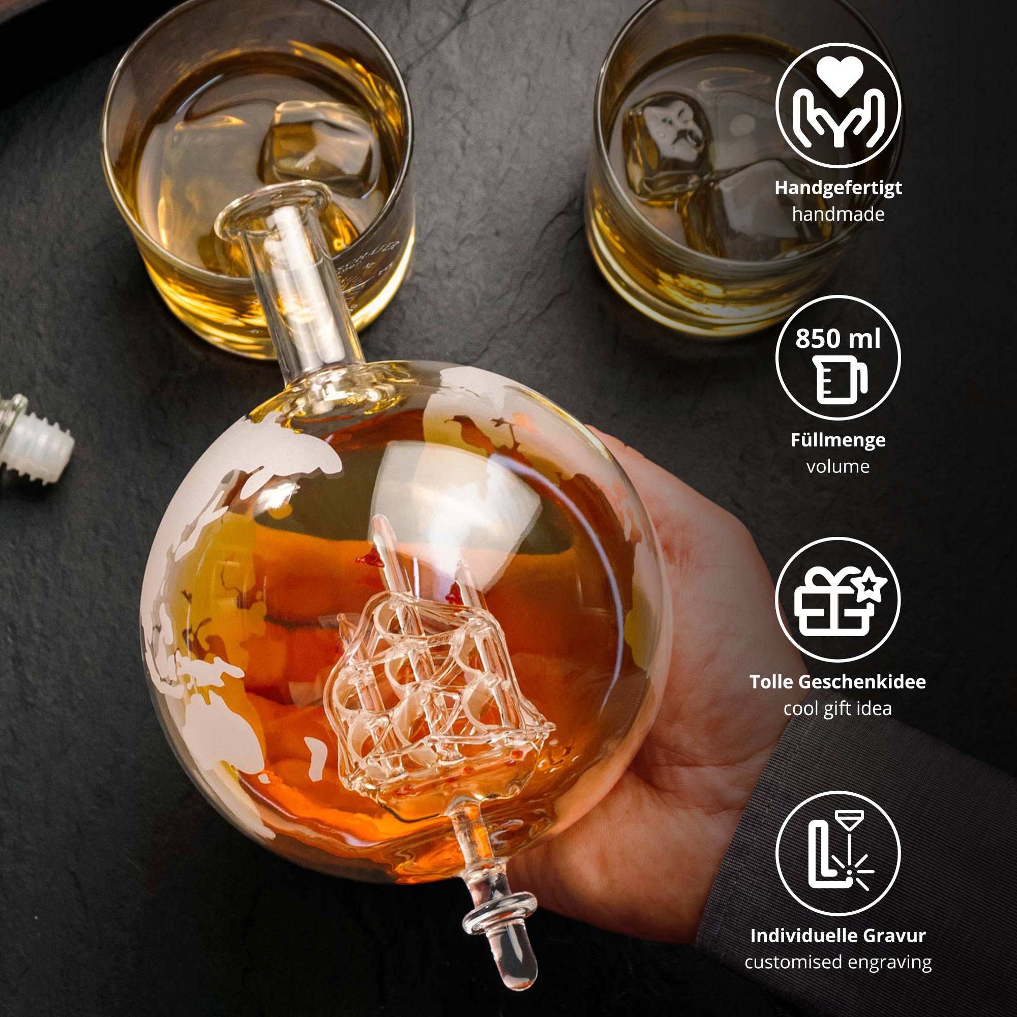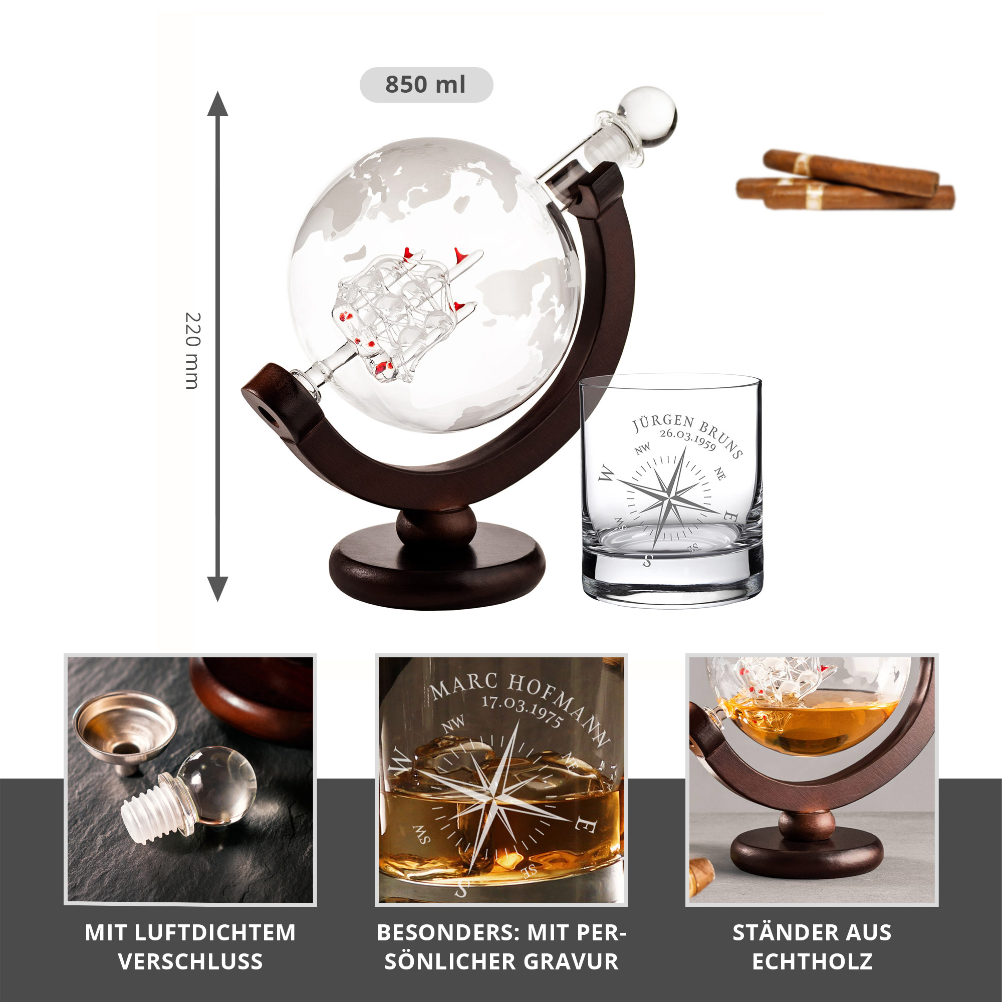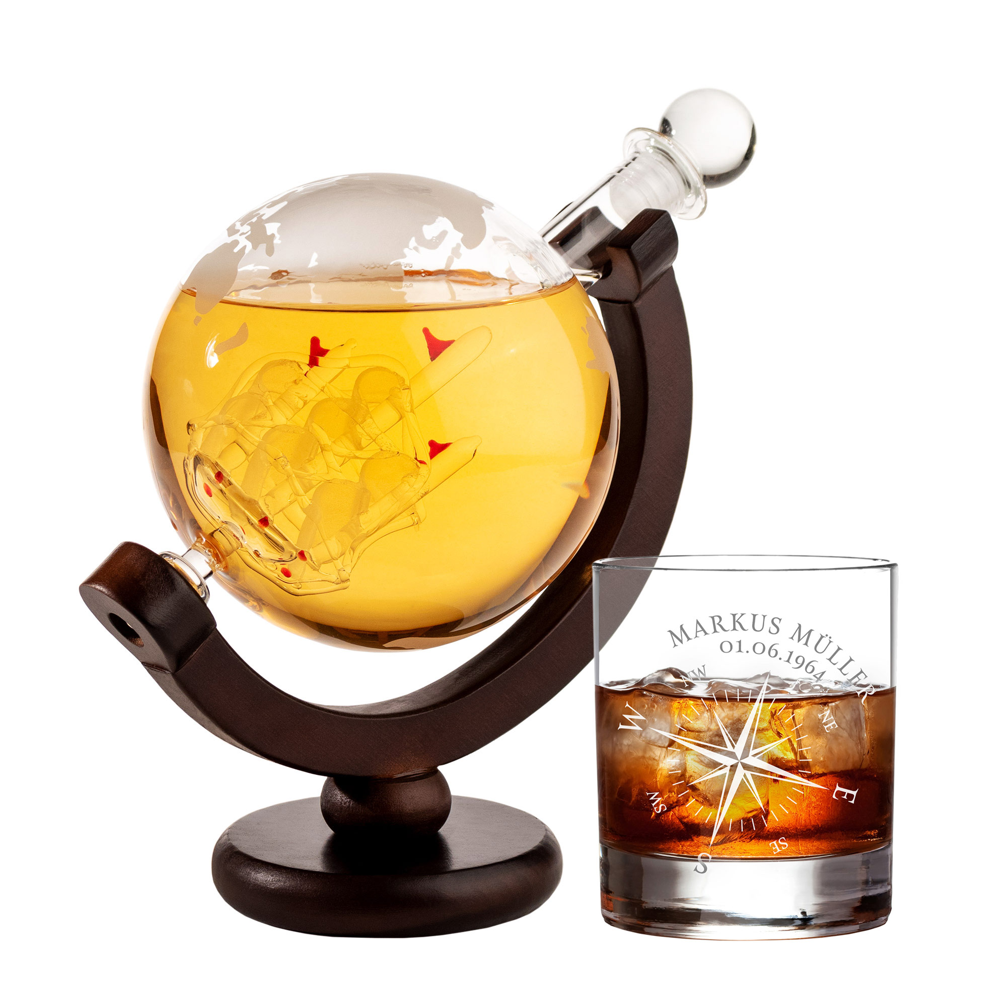 Weltgewandtheit und Genuss: Unser Whiskyset Karaffe Globus - graviertes Whiskyglas - Kompass macht sich überall gut und ist ein stilvolles Accessoire für alle, die Whisky und Whisky Geschenke lieben. Und ein tolles Whisky Set: Die schicke Karaffe für Whisky ist, zusammen mit dem Whiskyglas mit Gravur, perfekt für jeden Liebhaber und jede Liebhaberin von Außergewöhnlichem.