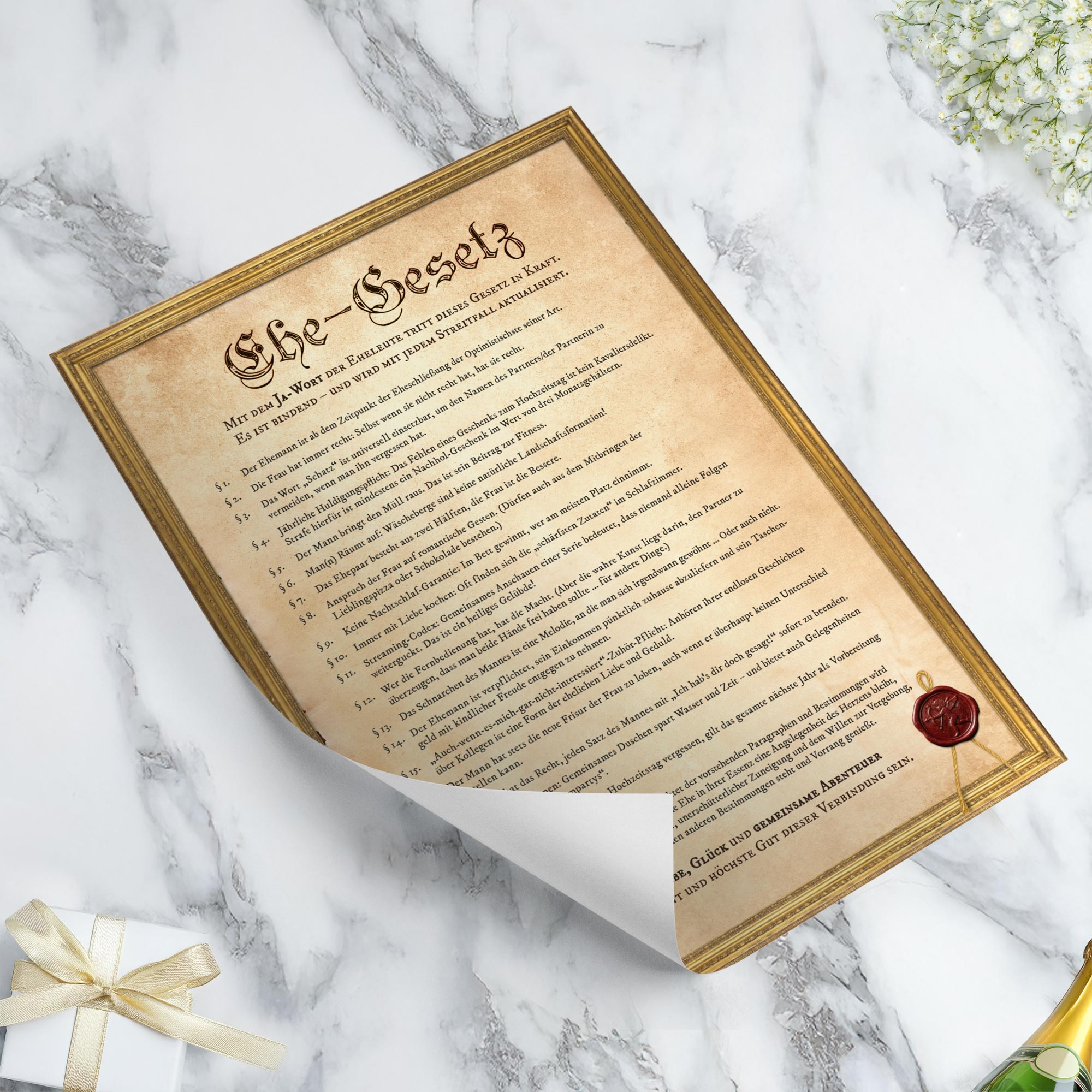 Manche Gesetze sollte man wirklich ernst nehmen. Dieses hier ganz bestimmt nicht. Das Ehe-Gesetz Poster in der Variante Historisch präsentiert 20 unterhaltsame Ehe-Regeln in klassischer Paragraphenform – humorvoll formuliert und im rustikalen Vintage-Stil gestaltet. Der Look erinnert an alte Urkunden oder historische Dokumente und verleiht dem Poster eine charmante, fast ehrwürdige Optik. Nur der Inhalt sorgt garantiert für Schmunzeln.