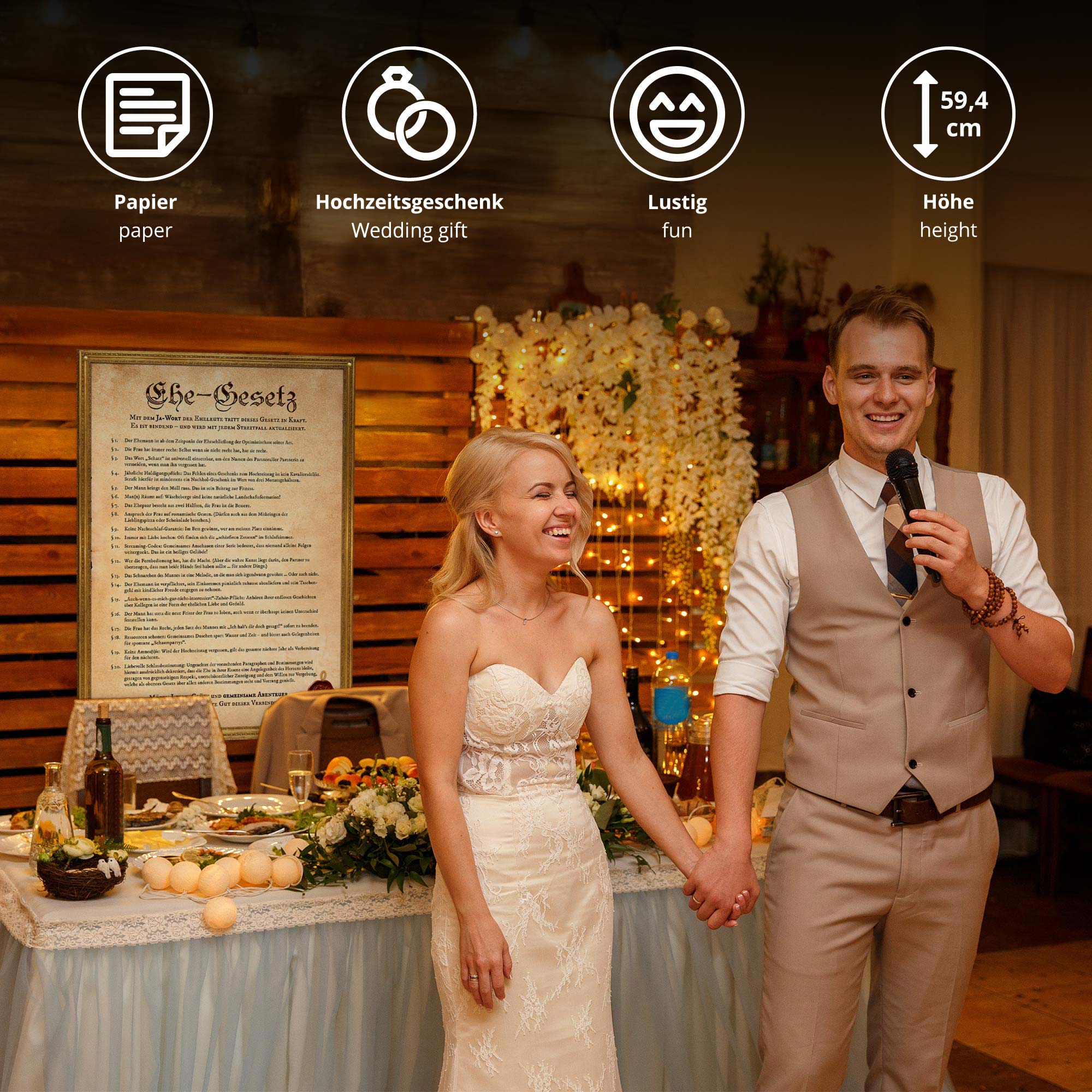 Ob als Hochzeitsgeschenk, zum Jahrestag oder als humorvolle Dekoration für das gemeinsame Zuhause – dieses "Zertifikat" erklärt mit einem Augenzwinkern, wie eine Ehe angeblich funktioniert. Von liebevollen Kompromissen bis zu charmanten Alltagsweisheiten ist alles dabei, was das gemeinsame Leben noch unterhaltsamer macht. Mit einer Größe von ca. 60 x 40 cm wird das Plakat zum dekorativen Hingucker im Wohnzimmer, Schlafzimmer oder auf der Hochzeitsfeier selbst. Ein Geschenk, das Humor beweist – ohne kitschig zu sein.